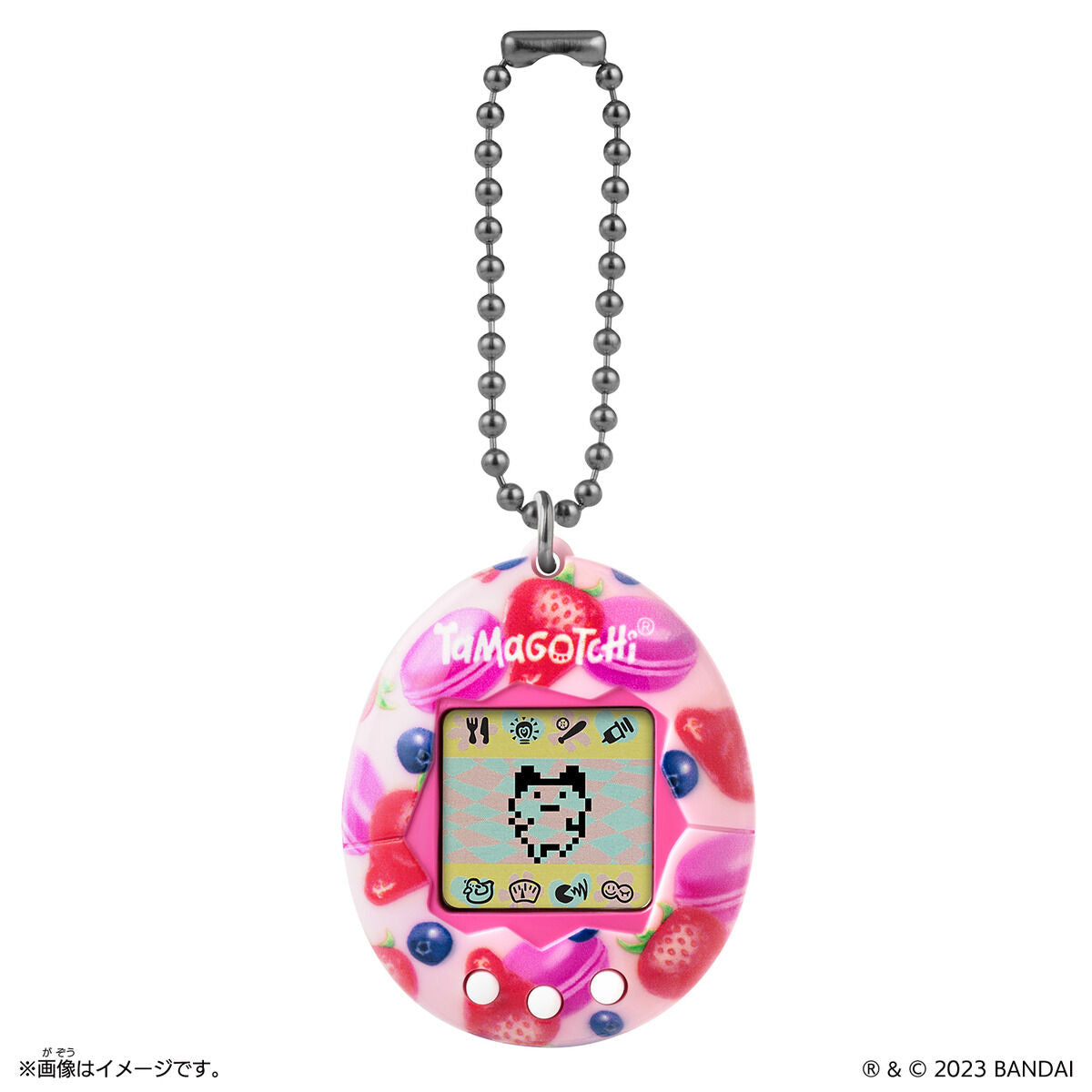 Berries and macaroons on a pink shell with white 'Tamagotchi' and buttons, dark pink frame and original programming and characters