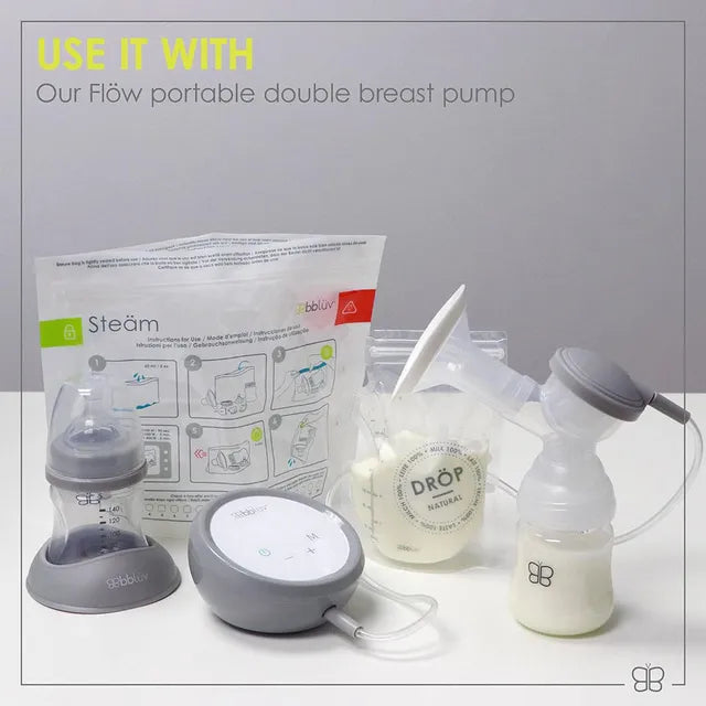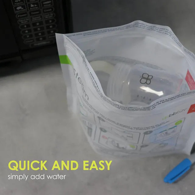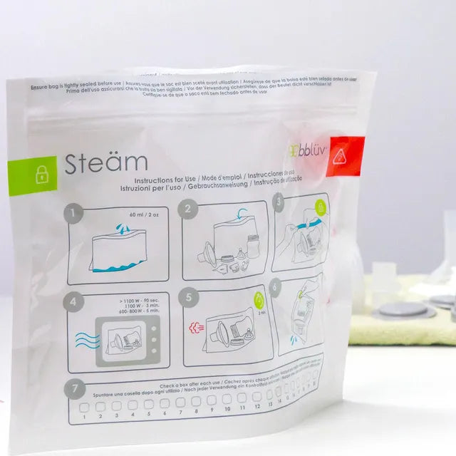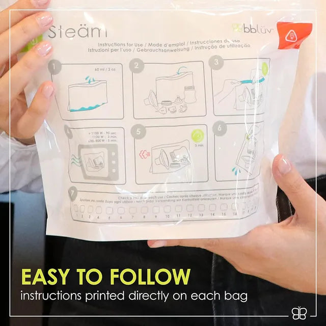 The Steam makes all your sterilizing needs easy, fast and convenient. Whether you want to sterilize your bottles, nipples, pacifiers, breast pump parts or other BBLuv product components, our Microwave Quick-Steam Sterilizer Bags effectively eliminate bacteria and germs in minutes! Each of the included 6 bags can be reused up to 20 times for a total of 120 sterilization cycles with easy to follow instructions printed on each bag.