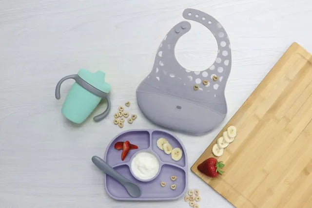 Feeding set for toddlers. For the happiness (and piece of mind) of every parent out there, we have brought together our mealtime essentials in a single box. This colorful and durable silicone set includes our spill-proof sippy Kup, our bib with its deep food Poket as well as our Yumi suction plate and its flexible spoon. The Sët is the perfect mealtime set for those looking to give a pretty and practical gift... or those who decide to keep it for themselves!