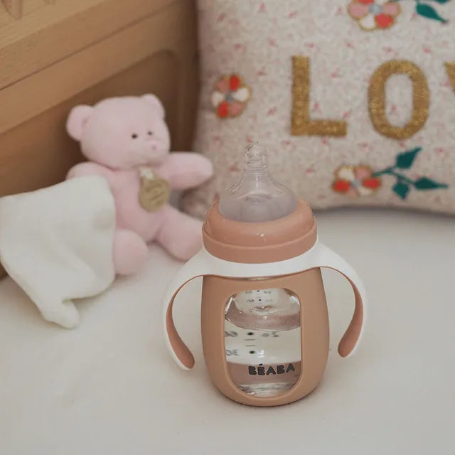 A 2-in-1 learning glass bottle with silicone cover perfect for encouraging little ones' independence.