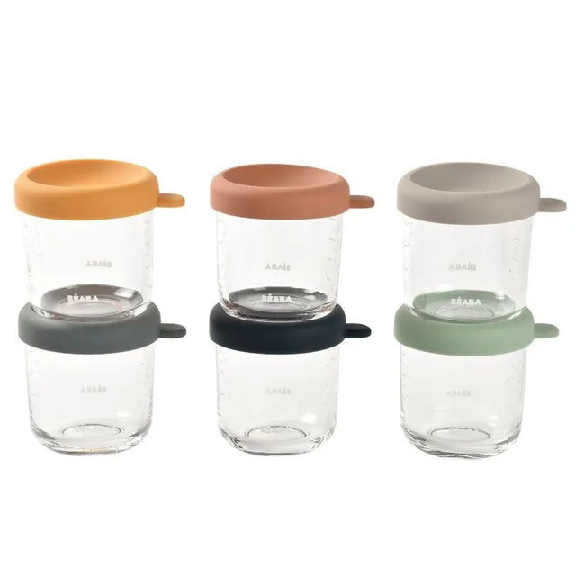 Set of 6 glass containers/jars with silicon lids. Soda-lime tempered glass containers, with a capacity of 250ml, graduated with 100% silicone lids. Colorful design set with 6 different colours of interchangeable lids.