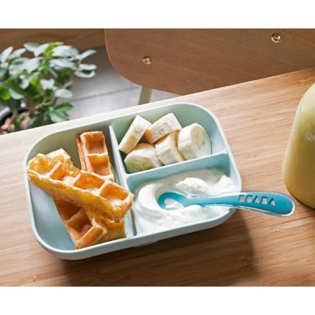 - Silicone mealtime set including a plate divided into 3 sections and a 2nd-age spoon