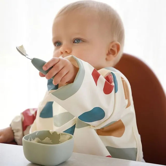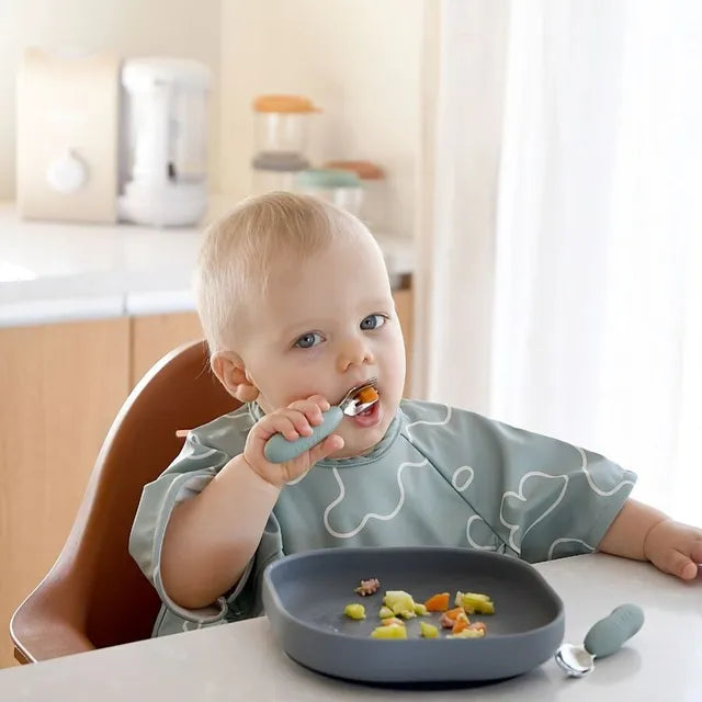 Set of 2 silicone and stainless steel pre-cutlery with ergonomic shapes to help children develop independence.