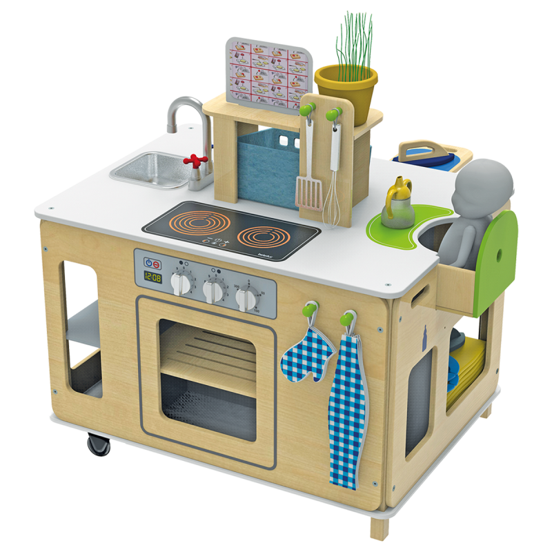 Cooking, washing, ironing and much more can be done at the new mobile household center! There is something to discover on every side: cooking corner with hotplates and oven and great recipe cards, pull-out high chair and everything to care for the doll, ironing and washing corner with iron and pull-out ironing board and a sink and trash can to keep things tidy. There are no limits to creativity here and several children can play together!Multi-functional toy, encourages imaginative play that promotes social and creativity skills, introduces real-life concepts play, develop fine motor skills and high quality