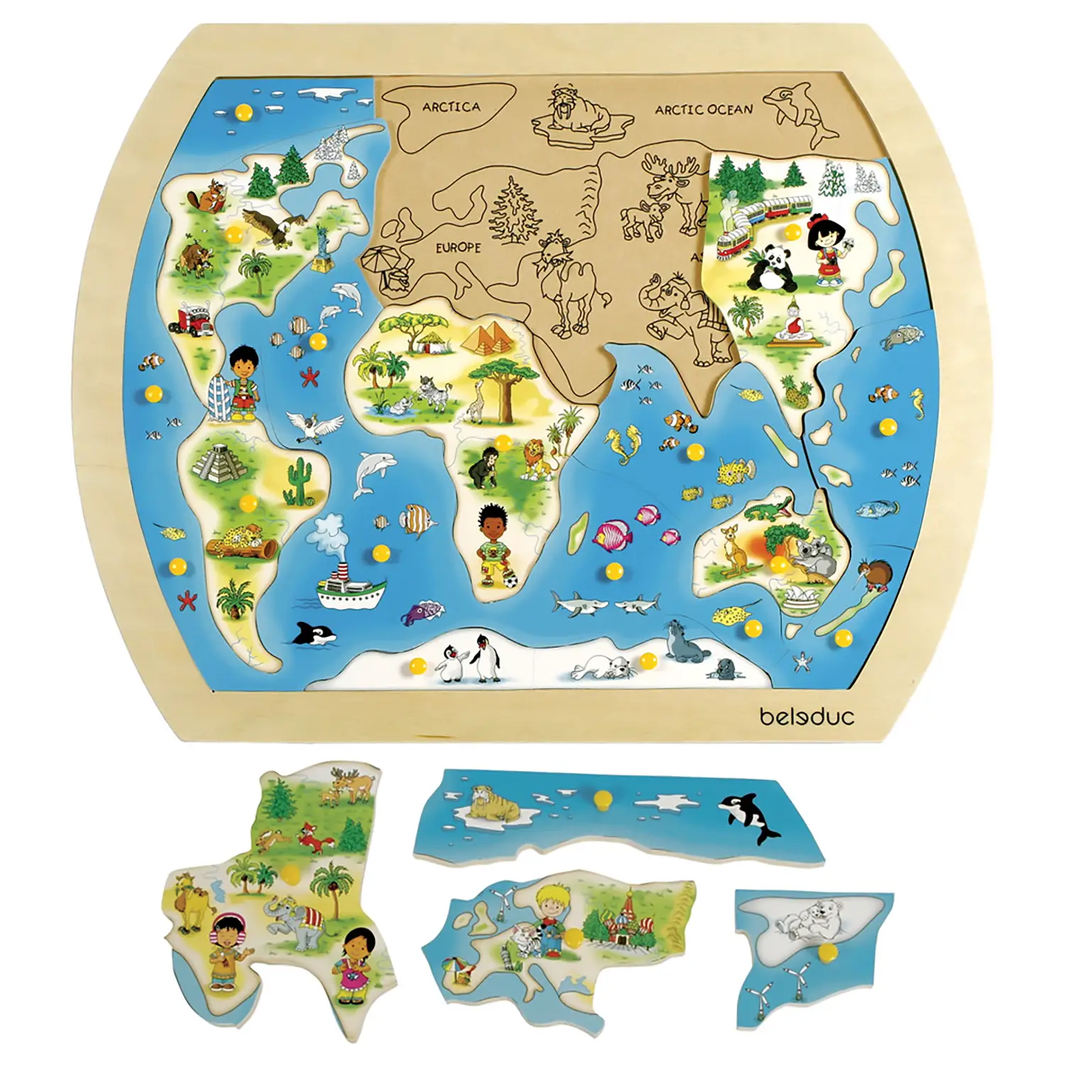 Beleduc Wooden World Map Puzzle for Kids ƒ?? 21-Piece Educational Geography Game with Continent Tiles & Reference Board ƒ?? Learn Continents, Cultures & Landmarks