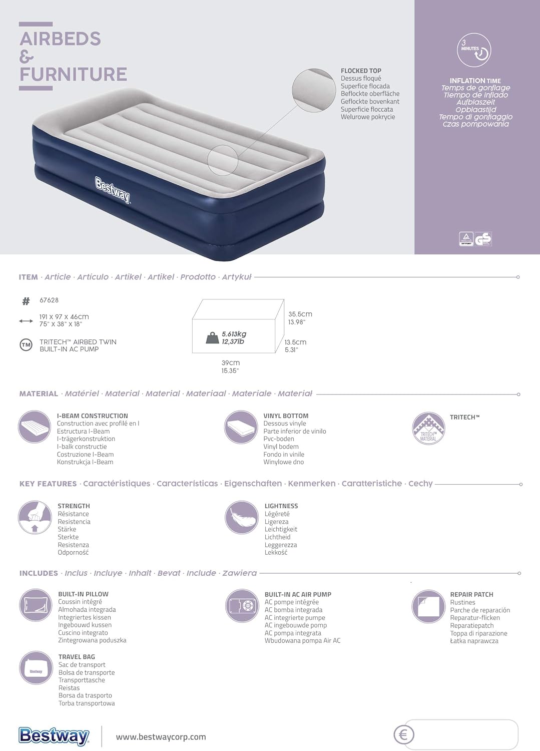 SIZE: 1.91M X 97CM X 46CM / 75 X 38 X 18. USER CAPACITY: 1. WEIGHT CAPACITY: 150 KG(330 LBS),INFLATES IN 3 MINUTES. SURROUNDING FRAME DESIGN PREVENTS ROLL-OFF AND INCREASES COMFORT,BUILT-IN 220-240V~ ELECTRIC AIR PUMP. TRITECH INTERNAL BEAMS ARE POLYESTER MESH ENCASED IN DURABLE PVC WHICH CREATES A DURABLE AIRBED,Comfortable flocked sleeping surface