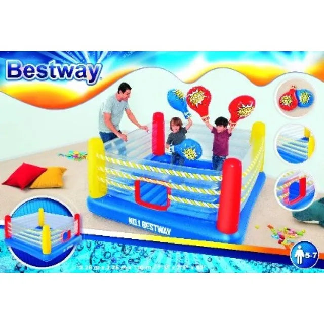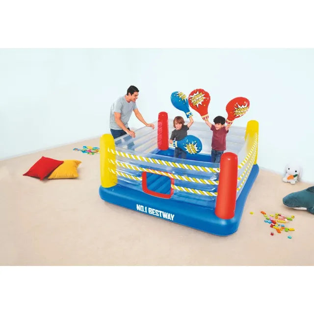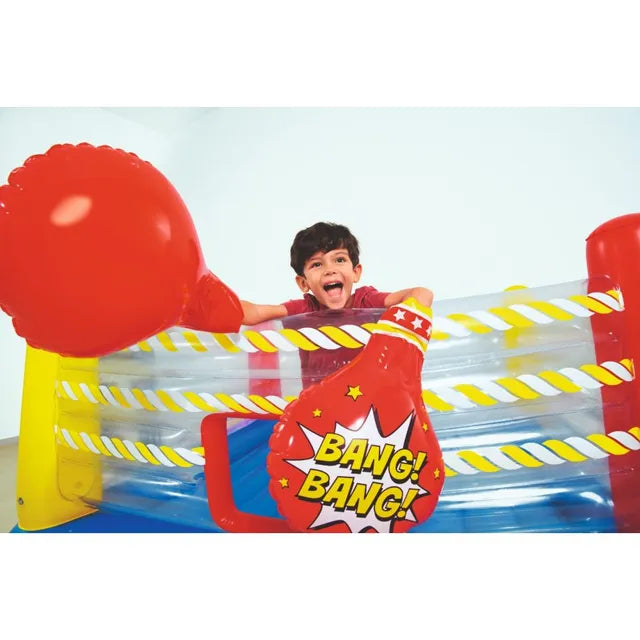 Inflated base provides extra comfort. Clear sidewalls let parents keep a watchful eye on children. Comes with a pair of boxing gloves. Perfect for hours of jumping and boxing fun.
