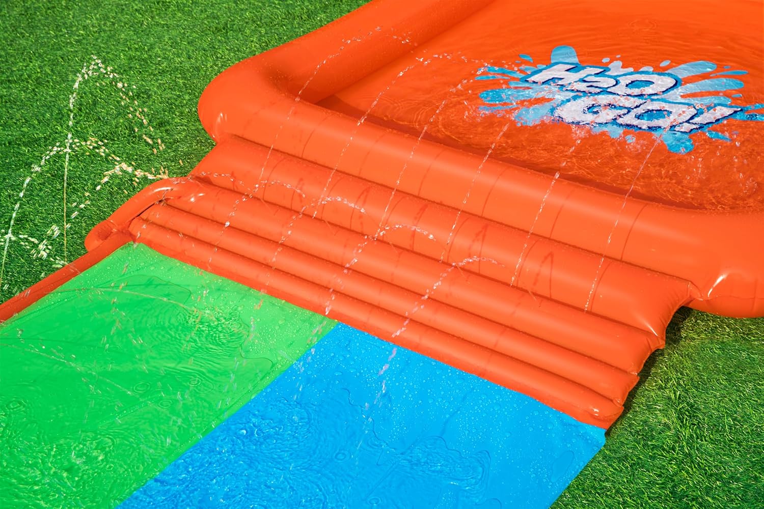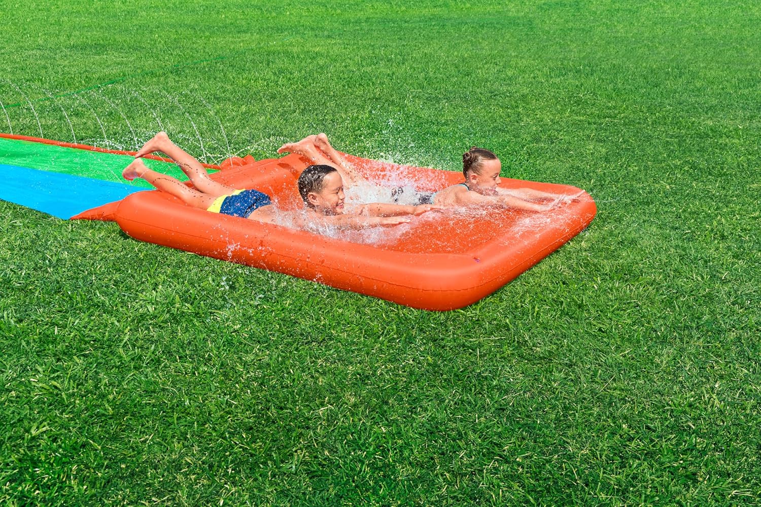 2 lanes are great for racing and entertaining groups.,Ramp at the end of the slide for extra speed into the drench pool.,Built-in SplashBoost™ Sprinklers are specially designed for more efficient coverage and keeping the lanes slick.,Extra-large drench pool at the end for an epic finish.