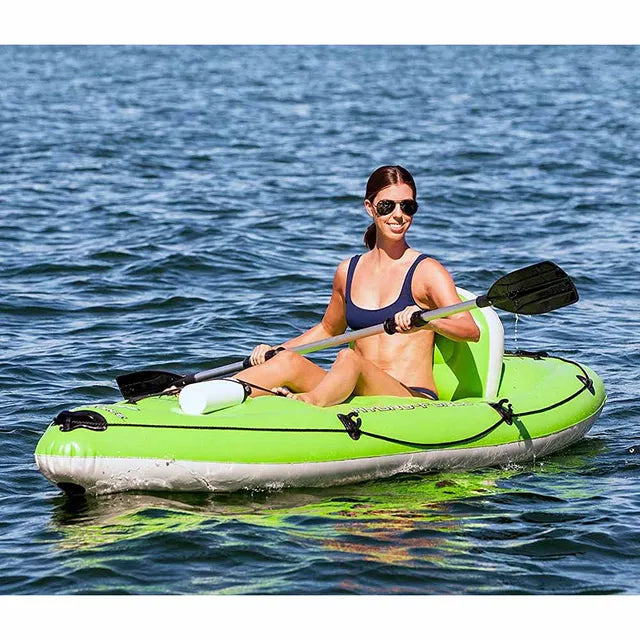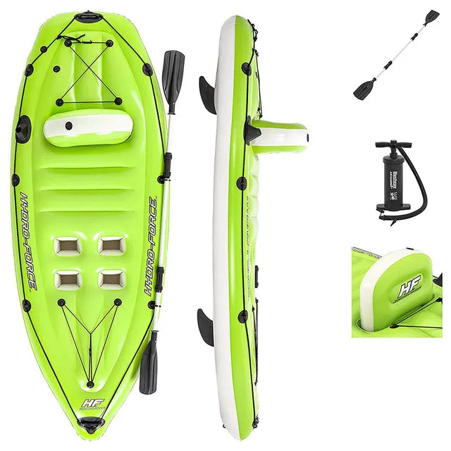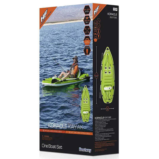 There's nothing better than relaxing on the water and fishing the day away. Now, you can fish in comfort with the convenient Hydro-Force Koracle Inflatable Fishing Kayak. Along with a built-in fishing rod holder and oar clasps, this kayak also features an inflatable backrest for ultimate relaxation. There are also 4 footrests to accommodate users of all heights, so anyone that uses this kayak is promised top-notch comfort. The Koracle Kayak is as convenient as it gets. Simply inflate it when you're ready to use it, and deflate it when you're done. It's perfect for transportation and compact storage. Plus, the dorsal fin is detachable, making it even easier to store this kayak. This set also includes an Air Hammer hand pump for simple, quick inflation, a paddle and a repair patch.