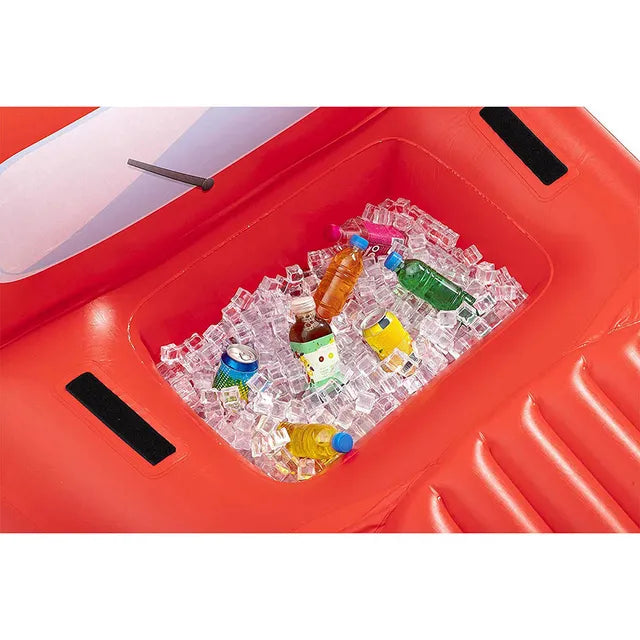 - 2 cup holders are strategically placed around the float, so you are always at arm's reach of your favorite drink. Stash beverages and ice in the convenient extra-large built-in cooler underneath the truck's hood. When the drinks are staying cold, the cooler lid acts as a cushioned seat