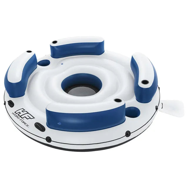 The Hydro-Force Lazy Dayz Inflatable Party Island brings the fun to the water for you and 3 friends or family members. The Lazy Dayz Island is made with Inflata-Shield material to prevent damage. This thicker material resists puncture, limits stretching and enhances grip. It also features 4 cup holders and 2 built-in storage compartments, so each person has a convenient place for their favorite drinks and snacks. With 4 extra-wide backrests and plenty of room to sprawl out, this island is as comfortable as it gets. The mesh opening in the center is perfect for when you want to dip your toes in the water. Heavy-duty handles allow you to hang on and help you get in and out of the float with ease. A grab rope wraps around the entire float, providing extra safety and ease when docking, or lets you latch multiple islands together to keep your friends near as you drift down the river or on the lake. Your day on the water with your friends or family wouldn’t be complete without the Hydro-Force Lazy Dayz Inflatable Party Island to lay back and relax on!