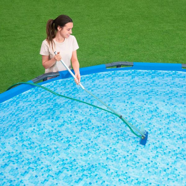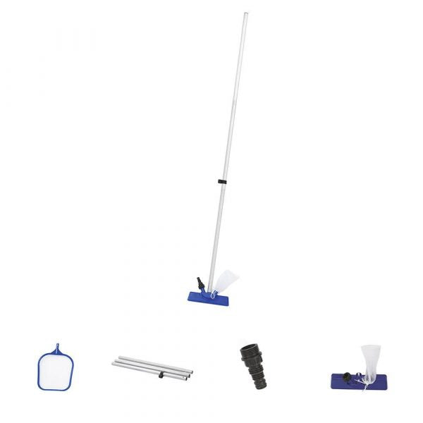 The Bestway 80 in Swimming Pool Maintenance Kit is the perfect starter kit for cleaning and maintaining 13 ft and above pools. The kit includes an 80 in aluminum pole and an interchangeable vacuum and skimmer head. The pool vacuum head connects to the pole and uses a standard garden hose for suction. No tools are required. Loose debris is sucked into a removable and reusable leaf bag. The skimmer has a durable mesh netting to collect extra unwanted debris. Keep your pool floor and walls clean all season long!