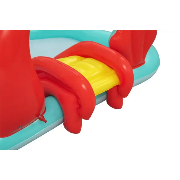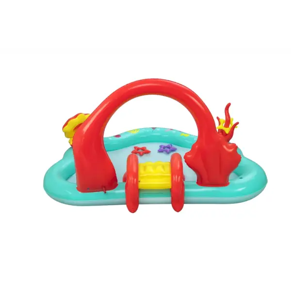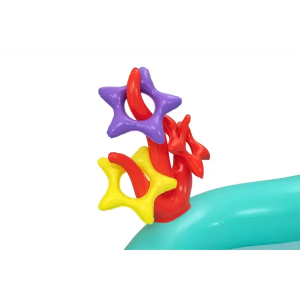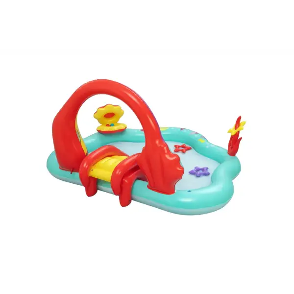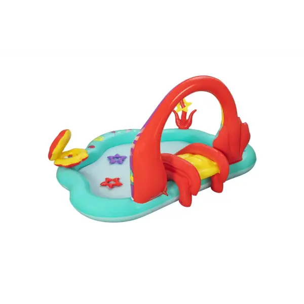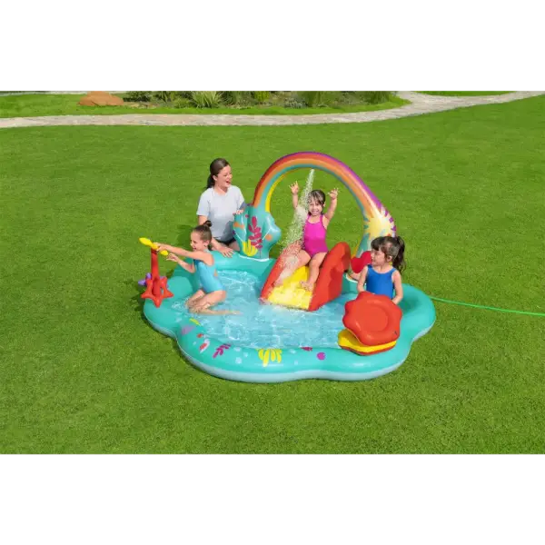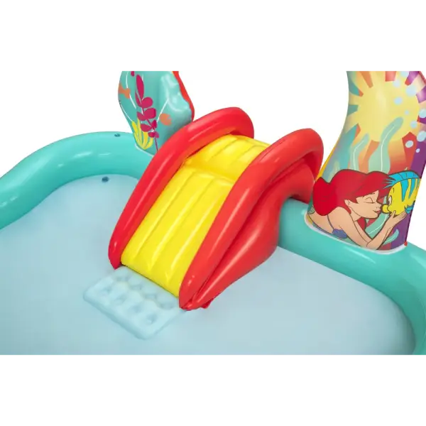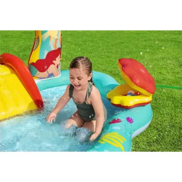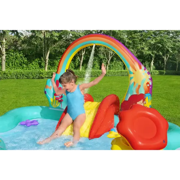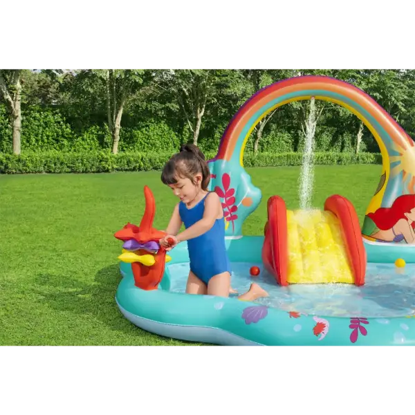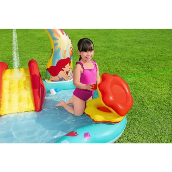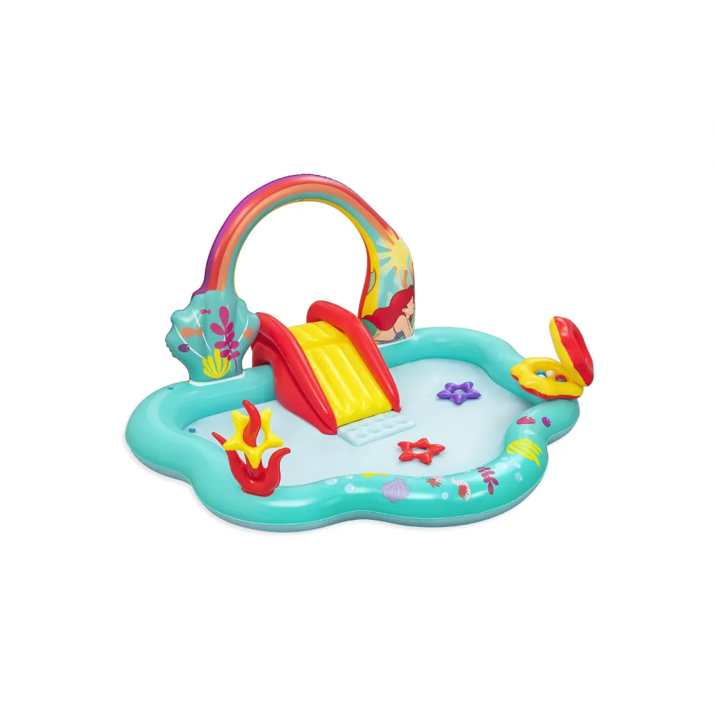 Built-in slide fused to the bottom for extra safety and security, the rainbow arch sprays water as your kids, ages 2 and up, splash into a lagoon and slide into the pool below.,Enjoy the play center with or without water for year-round fun and excitement. The Little Mermaid is always ready to go on a new adventure!,When the kids are done splashing and playing, release the pool water with the easy-to-use drain valve.,Play the seashell ball toss game with the 6 included balls or use the 3 star-shaped rings for the coral ring toss game
