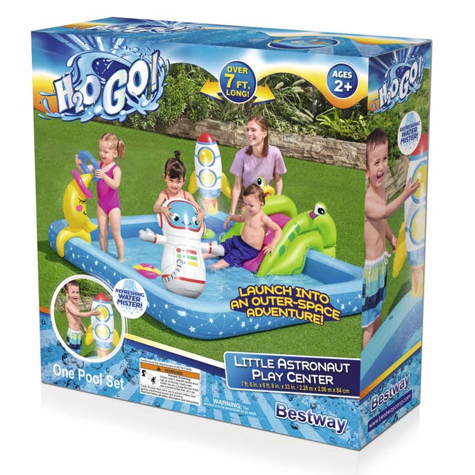 Beat the summer heat with your very own out of this world water play center. The- Bestway® Little Astronaut Play Center will take your child on a whimsical journey through the far reaches of outer space. Launch down the google-eyed alien slide into the pool below. Pass by the rocket ship and experience the cooling effect of the built-in water mister. This gentle sprayer will not only give soothing relief from the heat, but may also cause a rousing fit of wiggles and giggles. Simply connect a garden hose and let the fun begin.