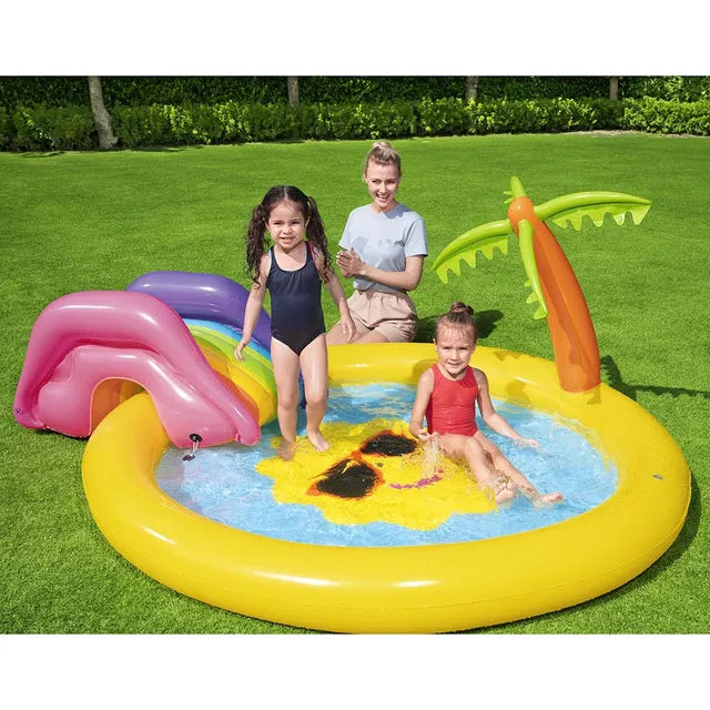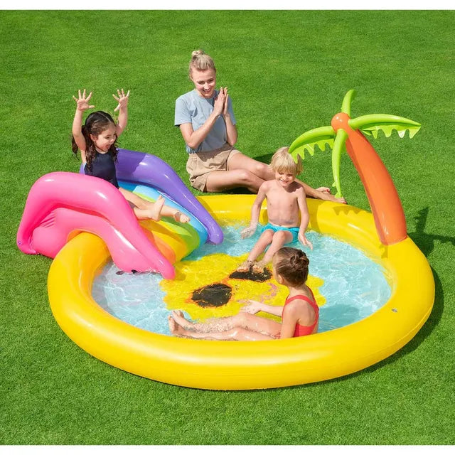 The sunnyland splash play pool is a haven for any toddlers on a hot summer day. The center sun design is friendly and approachable, but also serves as a built-in sprayer that'll cool off and entertain kiddos. Just fill the pool with water then connect to a garden hose and the fountain will kick into action! No pool is complete without a slide, and the sunnyland splash rainbow slide is fully adjustable (built-in grommets) and ready for action. The inflatable palm tree stands next the pool and can be used for balance when taking on the slide or as the perfect backdrop for that instragram shot!