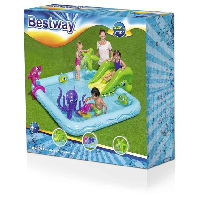 Play with the sea animals in the Bestway Fantastic Aquarium Play Center! Kids will have a blast swimming with the dolphin, clown fish and octopus. Plus, they can toss the included rings onto its tentacles! Attach a garden hose and the palm tree will spray water onto kids for additional fun and to keep them cool while they play in the sun. Kids can glide down the detachable slide into the play pool. The play center also has an easy-to-use drain valve to release the pool water so you can easily clean up and store the pool when you are done with it. For the ultimate summer full of fun, you and your kids need the Bestway Fantastic Aquarium Play Center!