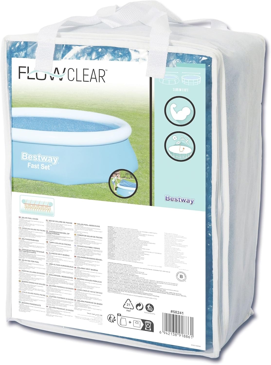 Flowclear 10'/3.05m Solar Pool Cover. Keep water and heat in and debris, leaves, and trash out of your pool with this Flowclear Solar Pool Cover. Above ground swimming solar pool covers create a greenhouse effect in your pool.Solar covers also prevent water evaporation caused by dry winds, or free-chlorine loss caused by UV rays. These covers are designed to keep water and heat in, but debris out. Extend your swimming season with a Bestway Solar Pool Cover. Fits 10'/3.05m diameter Fast Set and