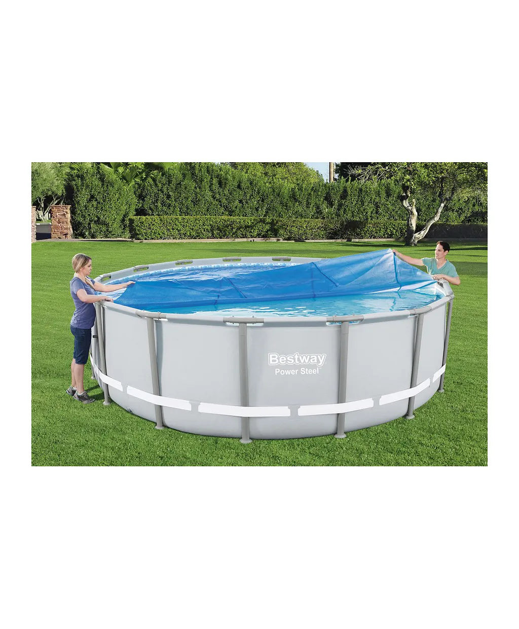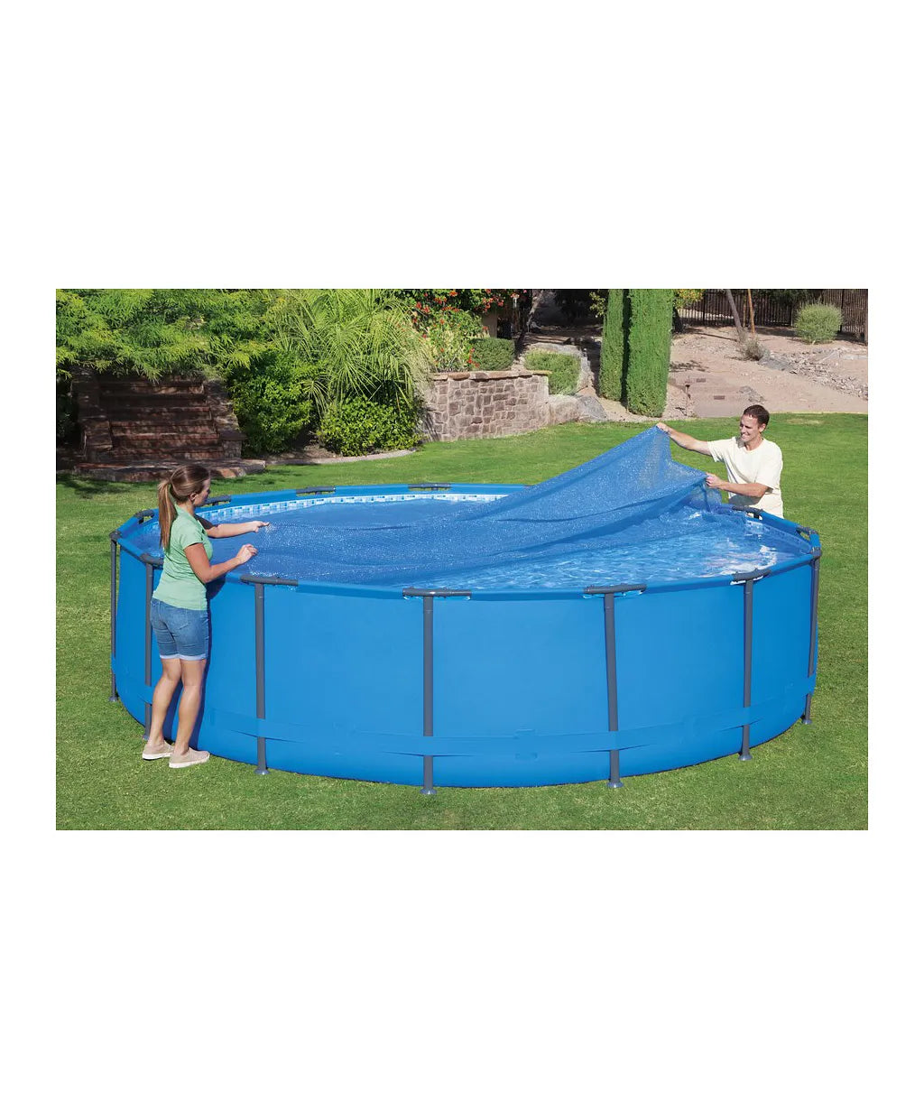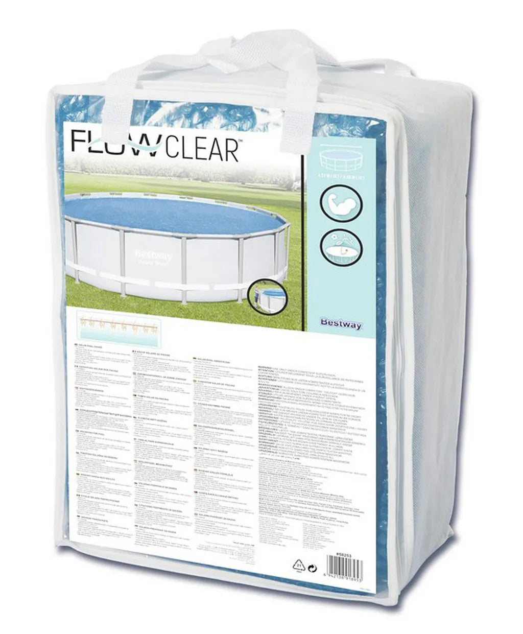 Keep water and heat in and debris, leaves, and trash out of your pool with this Flowclear Solar Pool Cover. Above ground swimming solar pool covers create a greenhouse effect in your pool. Solar covers also prevent water evaporation caused by dry winds, or free-chlorine loss caused by UV rays. , , These covers are designed to keep water and heat in, but debris out. Extend your swimming season with a Flowclear Solar Pool Cover. It fits 18'/5.49m diameter Fast Set pools