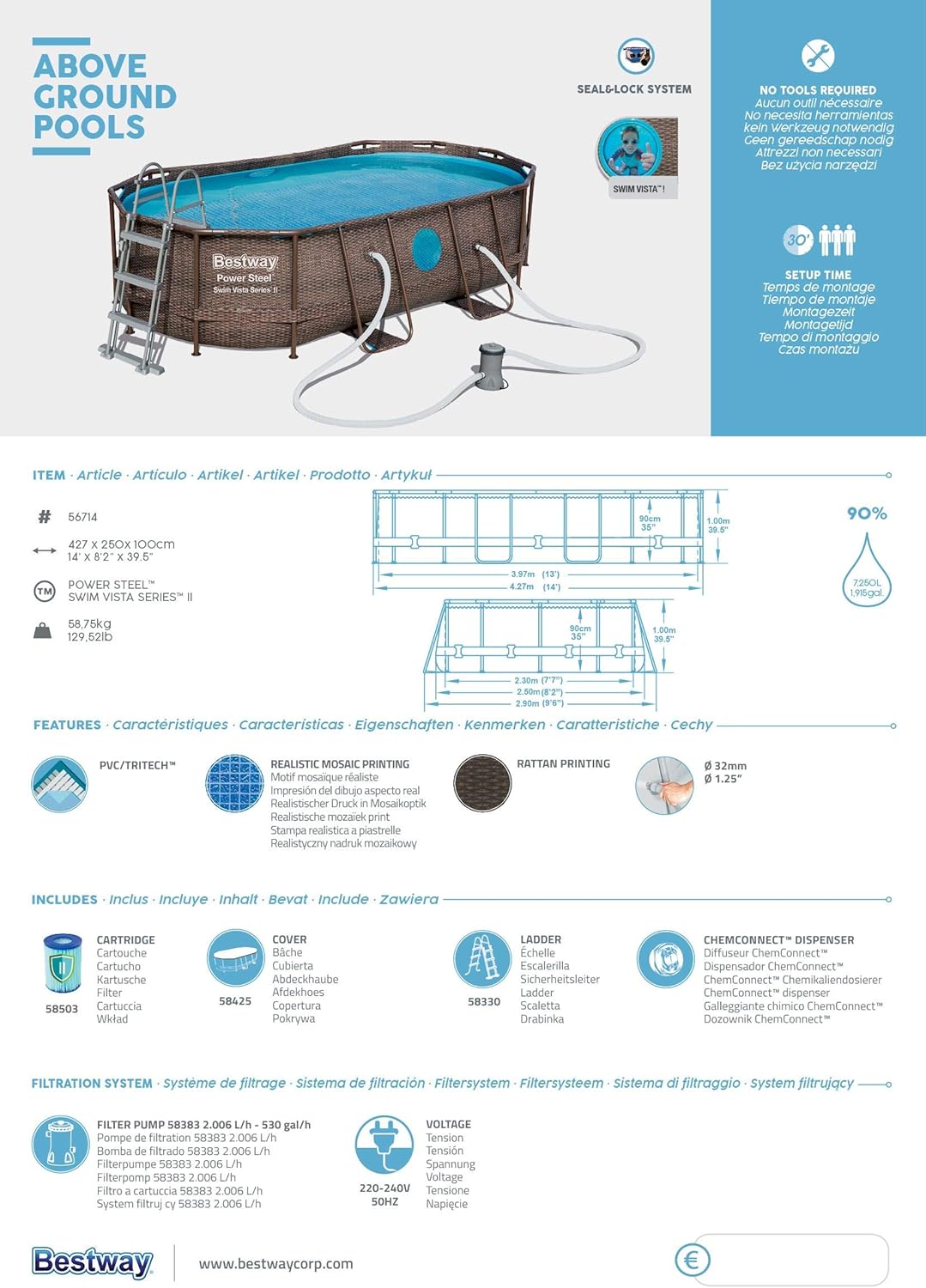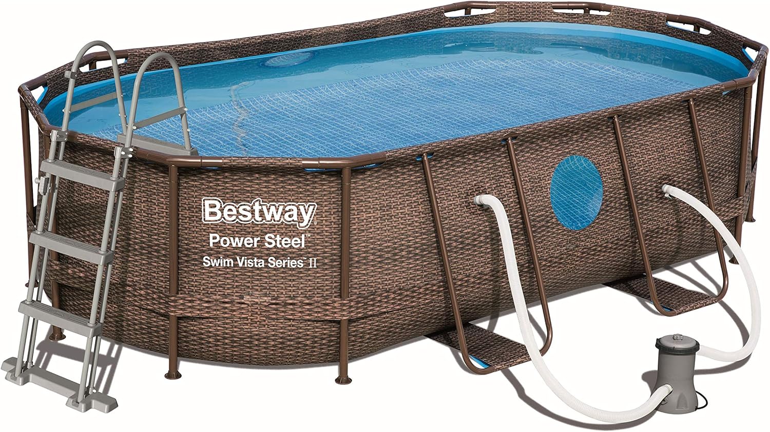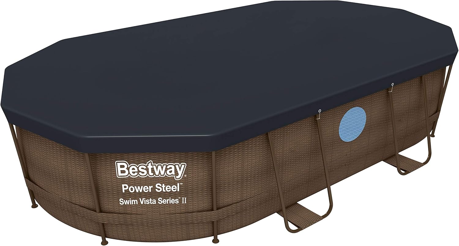 Bestway Power Steel Swim Vista Series 14' x 8'2" x 39.5"/4.27m x 2.50m x 1.00m Oval Pool Set - Corrosion resistant metal frames. Unique, realistic vinyl tile print provides an elegant decorative finish. Realistic Rattan Print offers mottled honey warm tones to your backyard. Both sturdy and durable avoids fraying and decay. Heavy-duty PVC and polyester 3-ply side walls. 3-ply band provides additional wall support. Built-in flow control drain valve makes it easy to drain by attaching the valve to a garden hose (with included adapter) to drain away water. The unique oval design and shape makes this pool more compact, so it requires less area for set up and less water to fill it up