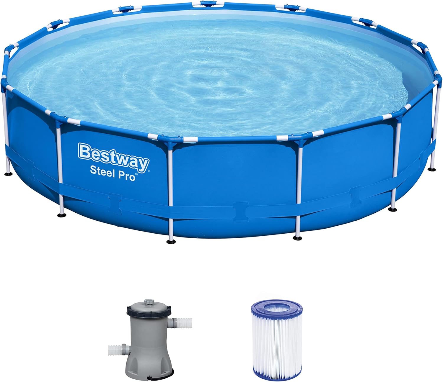Steel Pro 13' x 33"/3.96m x 84cm Pool Set. Easy 20-minute setup. Easy to dissemble when preparing for off-season storage. Water Capacity (90%): 8,680 L (2,293 gal.). Bestway Steel Pro Pools offer a simple option for families in search of a backyard pool for the summer season. Steel Pro pools feature puncture-resistant DuraPlus liners for combatting weather and other environmental elements. The pool frames are built with the FrameLink System - custom-molded T-connectors that prevent metal-on-metal corrosion. The round shaped models are the most cost-effective and a perfect starter pool for small families. These pools provide a great high-quality, affordable option, and they’re durable enough to last year after year.
