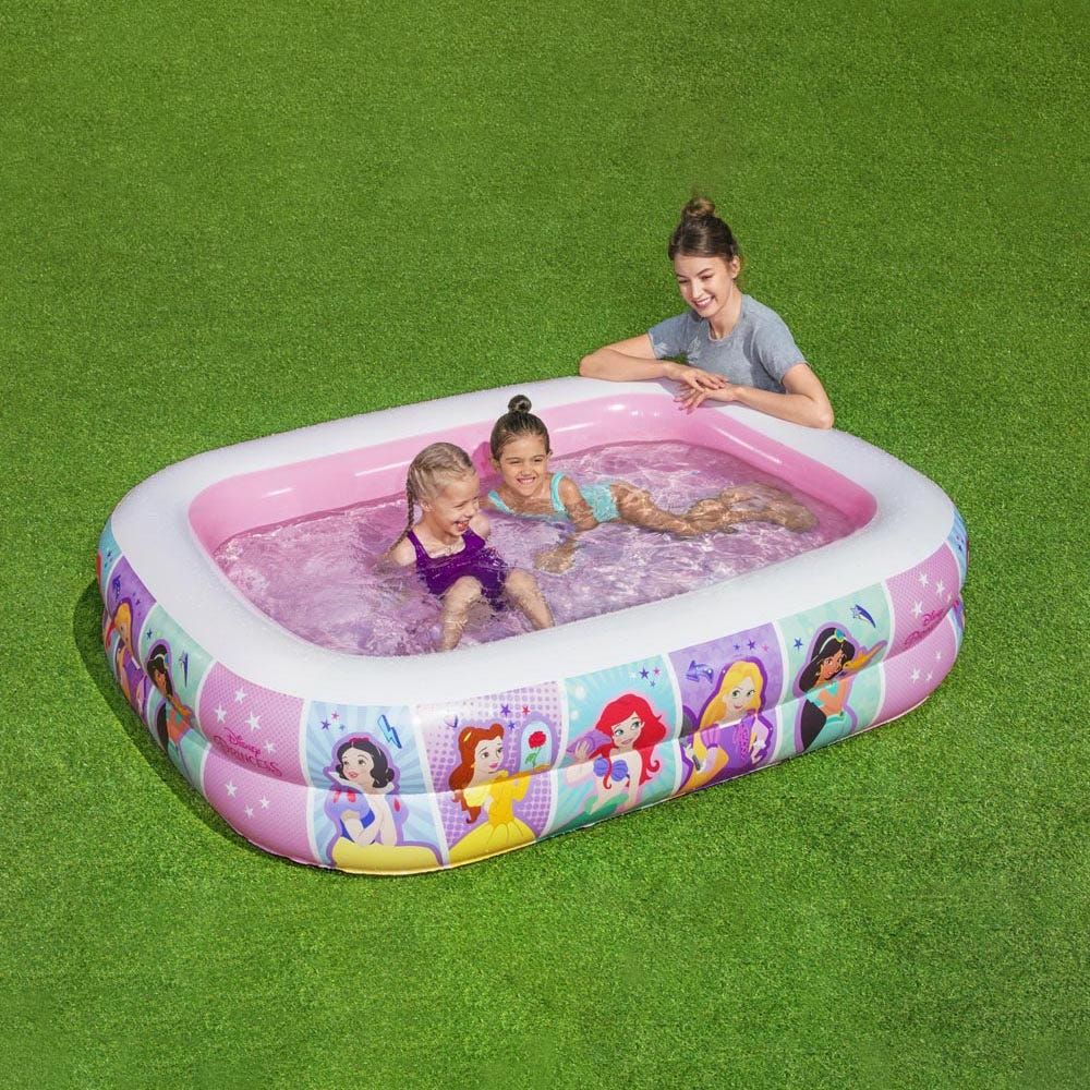 For the young at heart, a Disney? Princess Family Pool from Bestway? is fun as can be with plenty of personality. Featuring brightly colored Disney Princess? graphics, children will love their new Princess Family Pool. The pool is easy to set up by simply inflating the 2 rings, which have interconnecting nozzles. The sturdy vinyl, I-beam construction is designed to endure, while the extra-wide walls provide stability and support for rambunctious youngsters. At the end of the season, the water can be drained away with the easy-to-use drain valve. They will love what the Disney Princess? Family Pool has to offer, especially the laughter and smiles it will bring to their faces. Dream big, Princess!