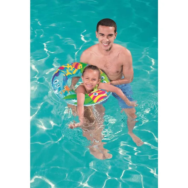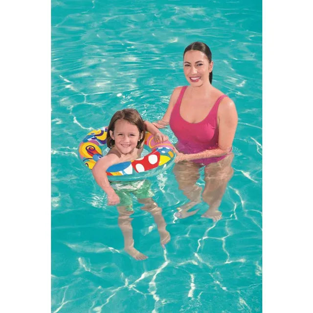 Easy setup and self-contained shelving for strategic in-store distribution, Children's swim ring with transparent top layer and print for more fun, Safety valve, Sturdy pre-tested vinyl.