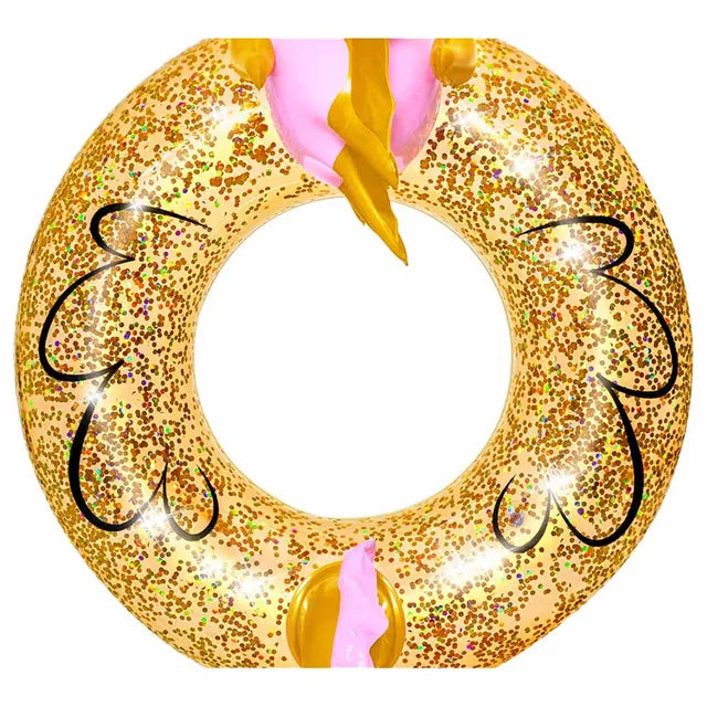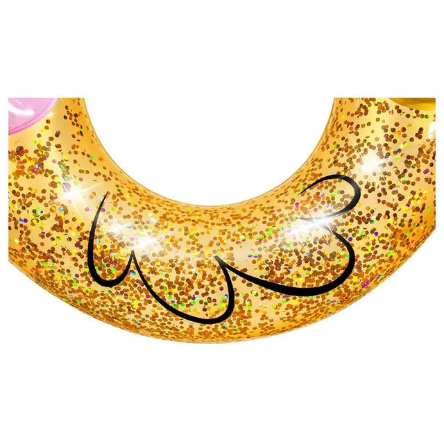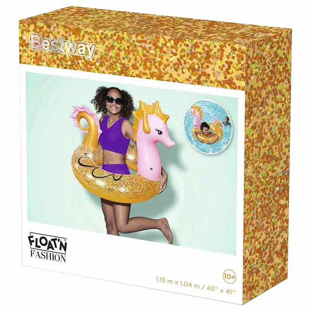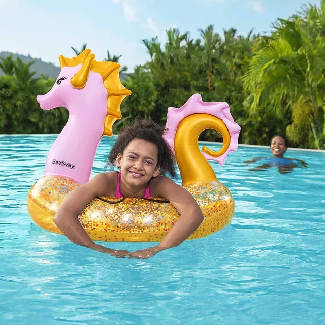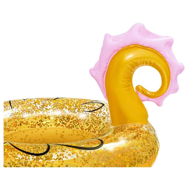 Sparkle like a diamond in the water with the Bestway Glitter Seahorse Swim Ring! This fashionable seahorse swim ring has a head and tail that inflates and extends away from the ring of the float to create an engaging, lively pool float to lounge on or pose with. Its picture-perfect golden coronet will make you look and feel like royalty on the water. The ring is infused with an abundance of glitter that sparkles and shimmers like a floating treasure trove on the beach, lake or pool.