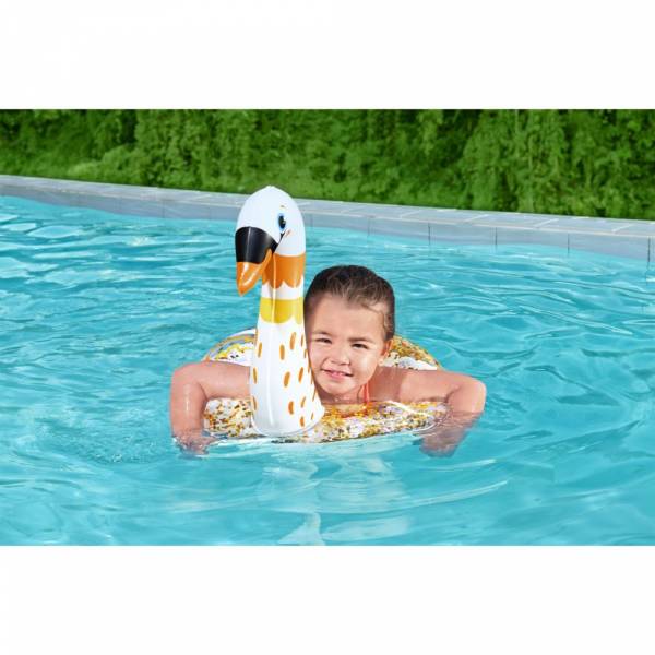 Glide into summer on top of the Bestway® Shimmer N’ Float Swim™ Ring! This inflatable ring has personality and appeal. The long, elegant neck on this animal float is perfect for grabbing on or leaning against. This swim ring is constructed with air chambers to make inflation and deflation easier and to help with buoyancy on the water. The durable material used to craft this glamorous creature is pre-tested to ensure longevity summer after summer. The ring is infused with a wealth of glitter that sparkles and shimmers on the beach, in the lake, or at the pool. And with its easy ability for storage, the Shimmer N’ Float Swim Ring will bring sparkles to your summers for years.