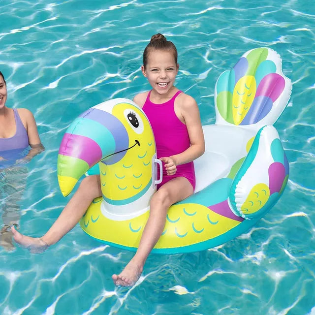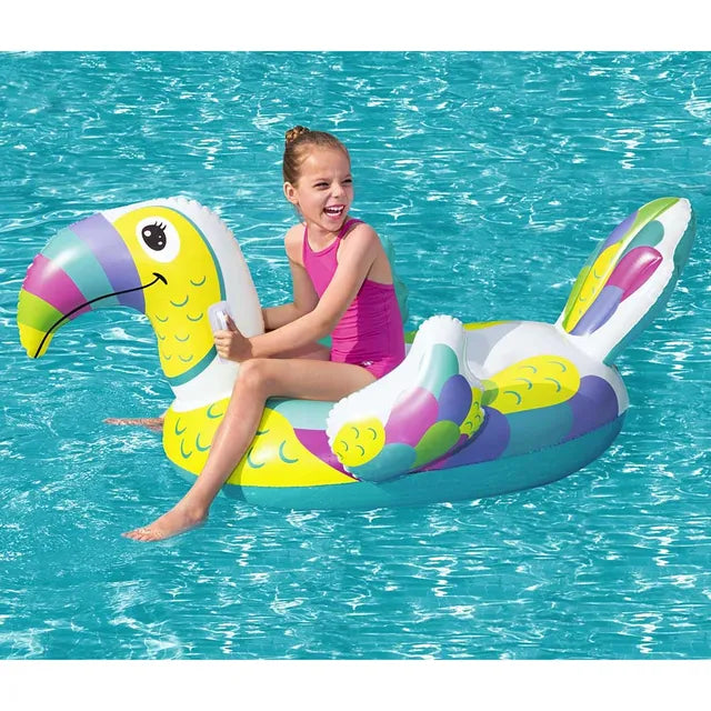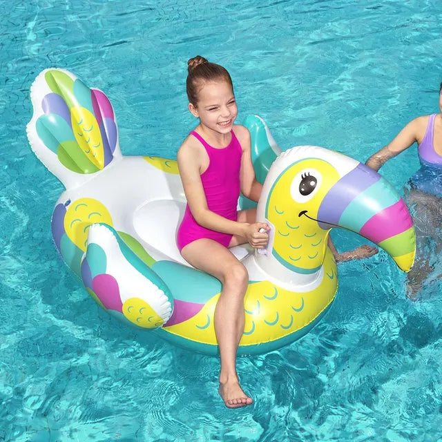 The Bestway Toucan Pool Day Ride-On is a safe and comfortable water chauffeur for any bird-loving kid. This pool float has a large base for safe riding and a large toucan head for fun photos or to rest against. Two sturdy handles make it easy for kids to hang on as they ride and float through the water. The toucan graphics, colors and physical features provide a unique visual appeal. Just inflate and you?re ready for a fun pool day. Deflation and storage is hassle free so you can continue using this inflatable pool float for years to come. Every kid will enjoy a ride on the Toucan Pool Day Ride-On!