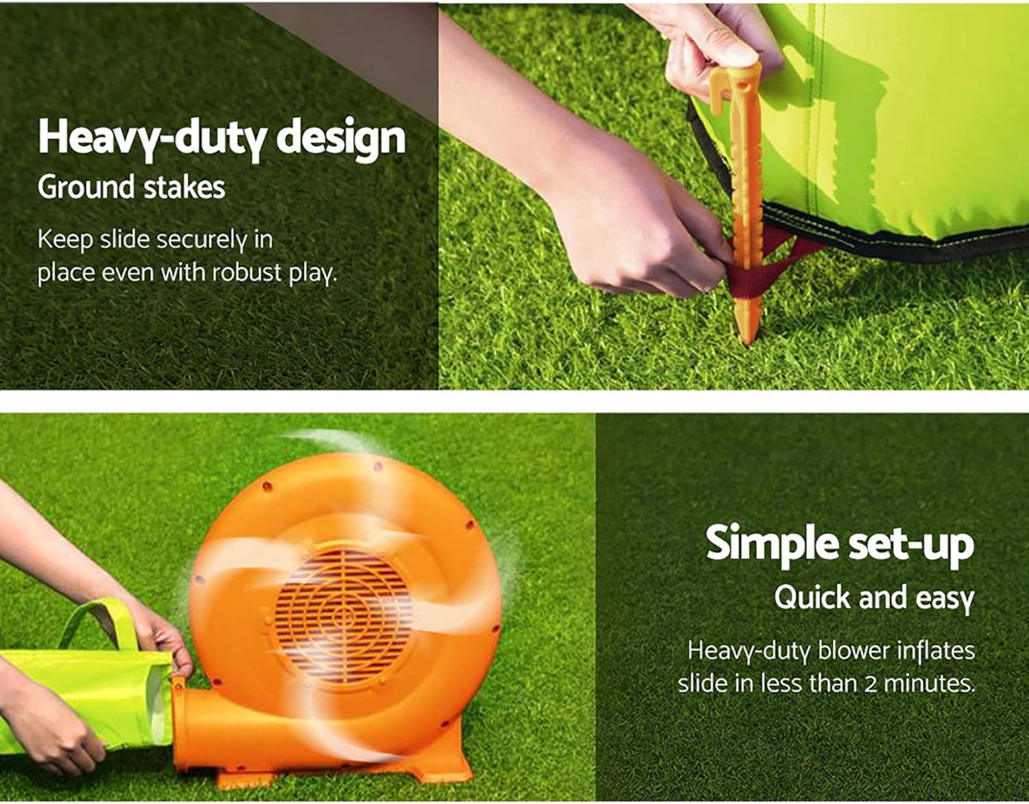 - Setup is quick and easy; The heavy-duty blower inflates the water park in less than 2 minutes