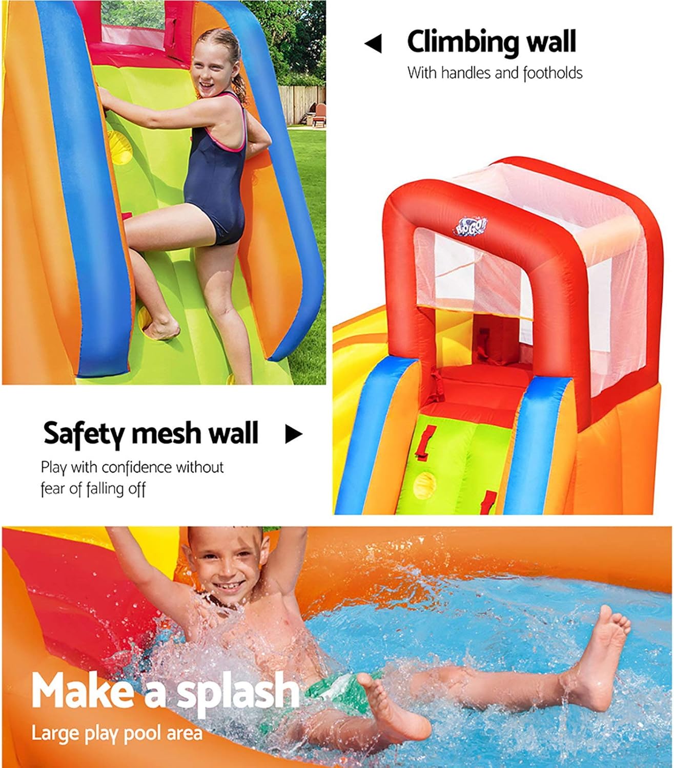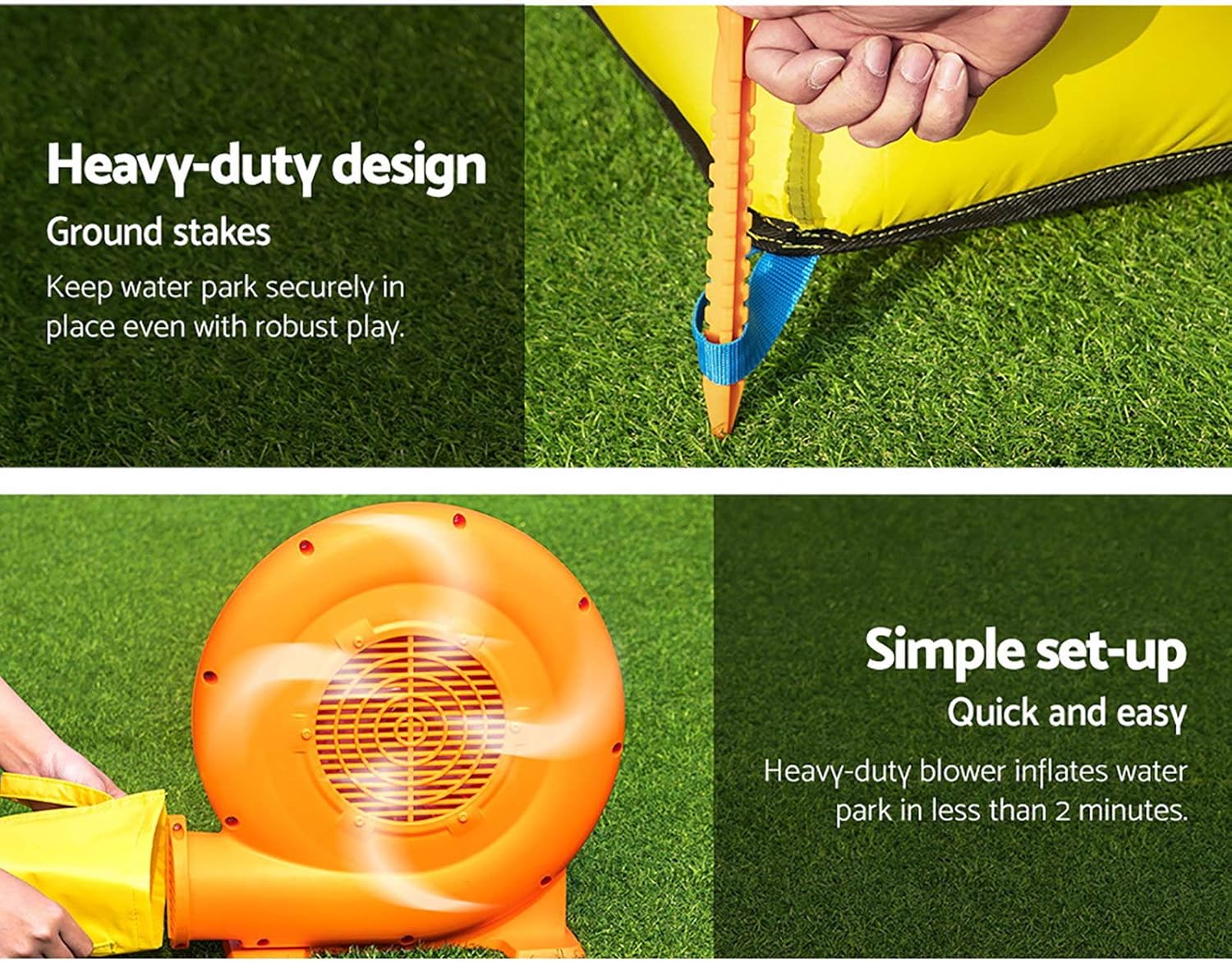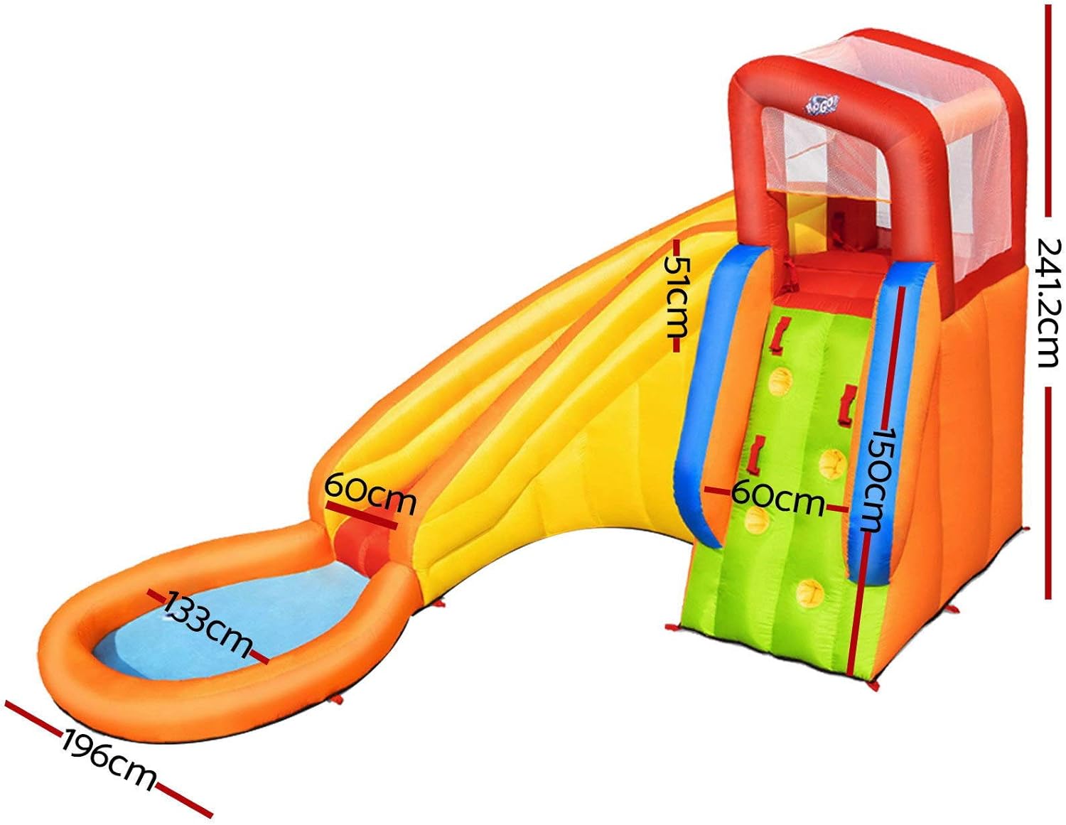 This water park from Bestway offers endless fun for children aged 5 and over. The play centre is equipped with a water slide, a climbing wall and a swimming pool. The slide has an integrated water sprayer. This way it is kept wet with water continuously. In addition, the tower is surrounded by a protective grille for the necessary safety. The children's pool is made of robust polyester with a PVC coating. Thanks to the powerful TÜV Rheinland GS certified permanent fan (220-240V/520W) it can also be fully inflated in less than 2 minutes. The pool is intended for outdoor use only.