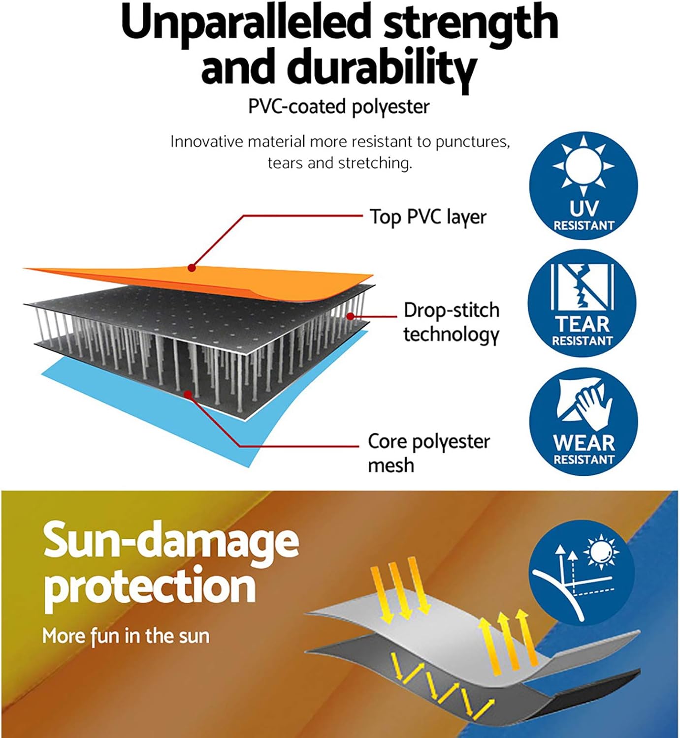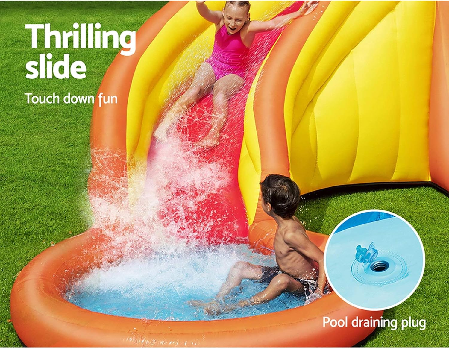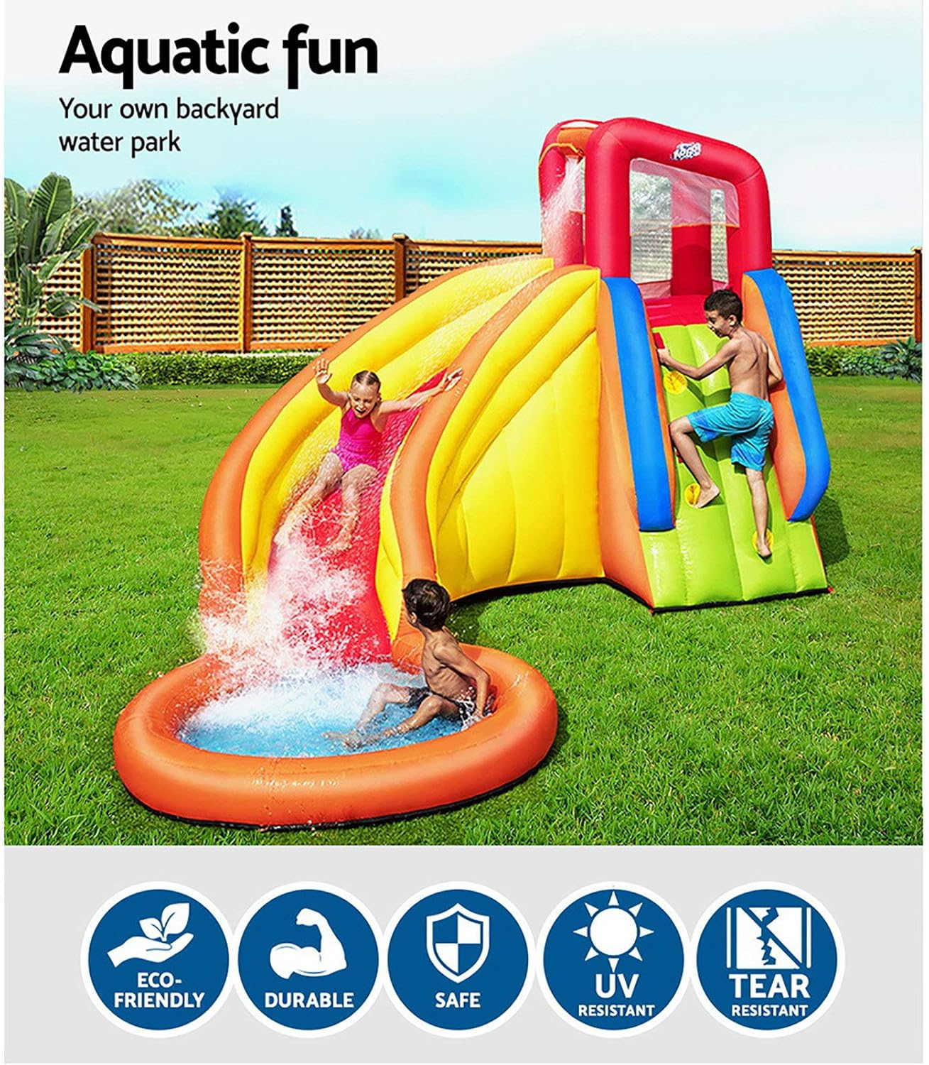 This water park from Bestway offers endless fun for children aged 5 and over. The play centre is equipped with a water slide, a climbing wall and a swimming pool. The slide has an integrated water sprayer. This way it is kept wet with water continuously. In addition, the tower is surrounded by a protective grille for the necessary safety. The children's pool is made of robust polyester with a PVC coating. Thanks to the powerful TÜV Rheinland GS certified permanent fan (220-240V/520W) it can also be fully inflated in less than 2 minutes. The pool is intended for outdoor use only.