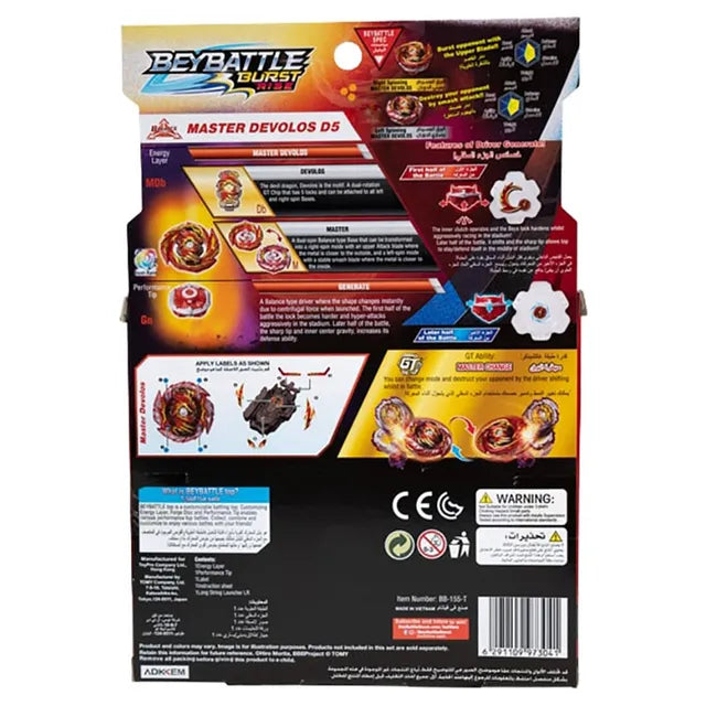 Includes left right-spin balance type battling top Master Devolos D5 with authentic components. Comes with long string LR launcher and sticker sheet.