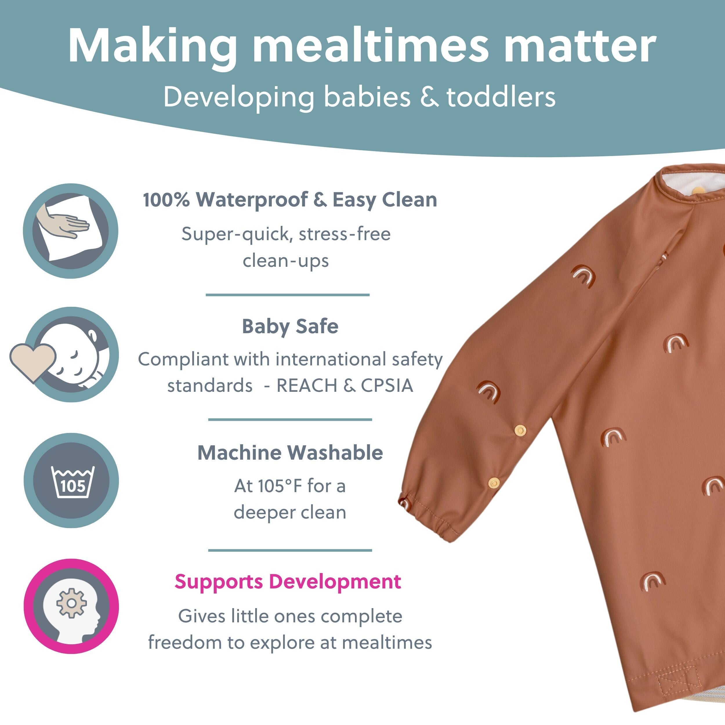 Adjustable neck and sleeves provide a snug, comfortable fit, keeping little ones happy and content during mealtimes.