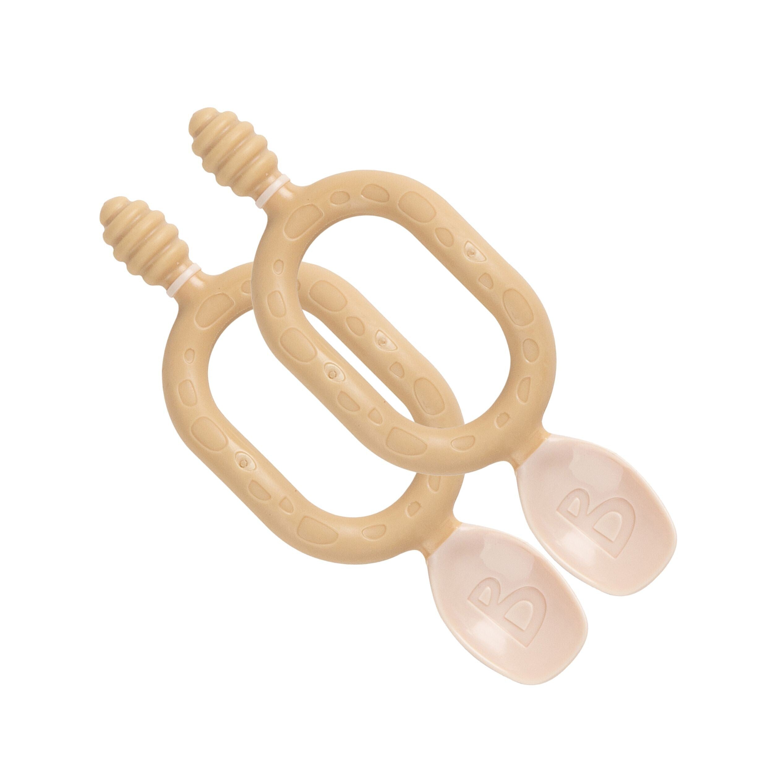 - The first two-handed baby spoon The ergonomic and innovative two-handles allow for ease of control even with the youngest of babies – this frustrations from dropping, and means more food reaches their mouth. Ultimately, this establishes successful self-feeding and a more enjoyable mealtime for all. Lovingly designed to give them independence before their wrist control develops.