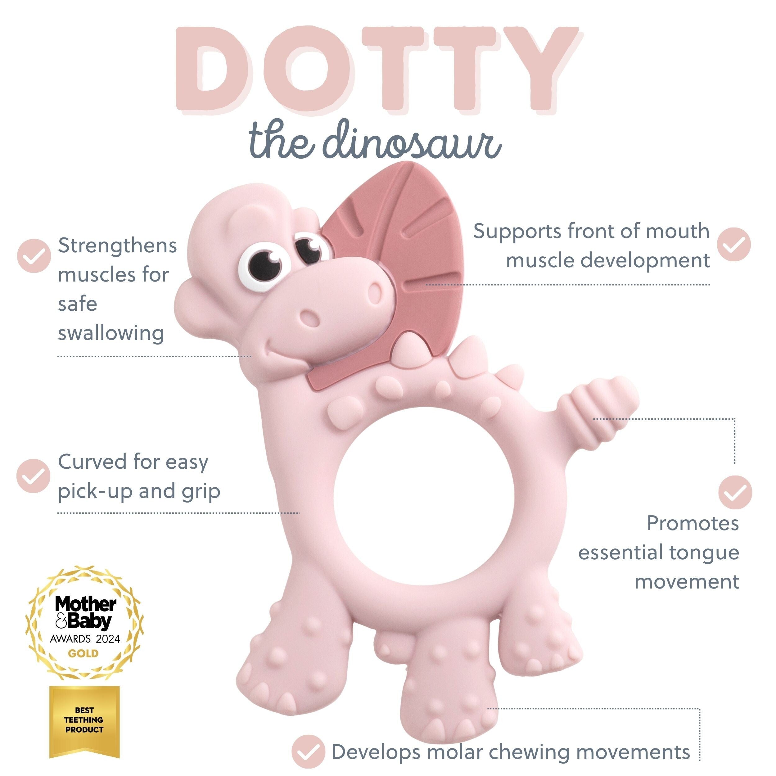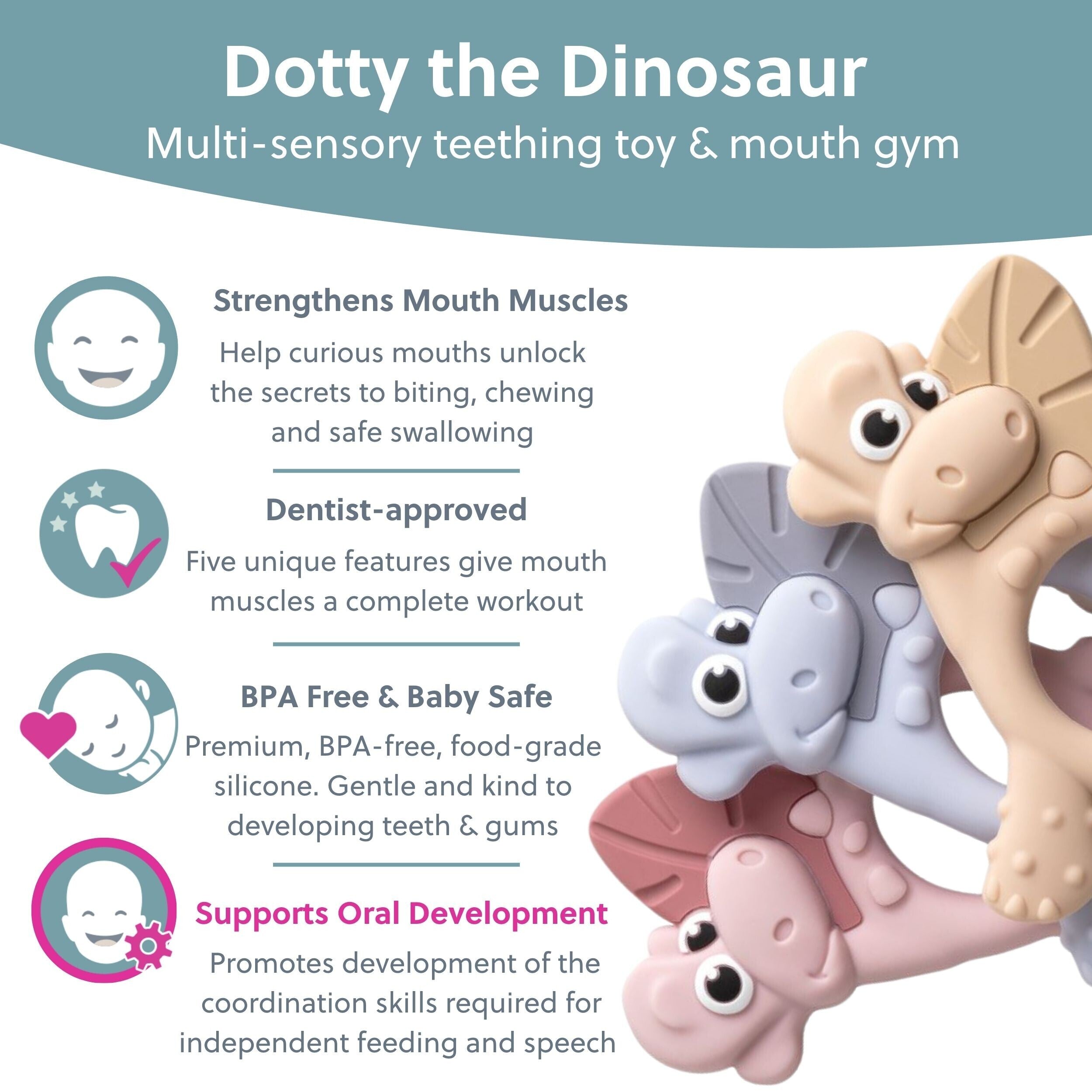 Soothe sore gums and stimulate your babyƒ??s senses with the Bibado Sensory Teether featuring Dotty the Dinosaur! Crafted from soft, food-grade silicone, this adorable teether is designed for tiny hands to grip and chew safely. With varied textures to explore, it provides comfort during teething while promoting sensory development. Lightweight, durable, and easy to clean, Dotty the Dinosaur is the perfect companion to help relieve teething discomfort and keep little ones engaged.