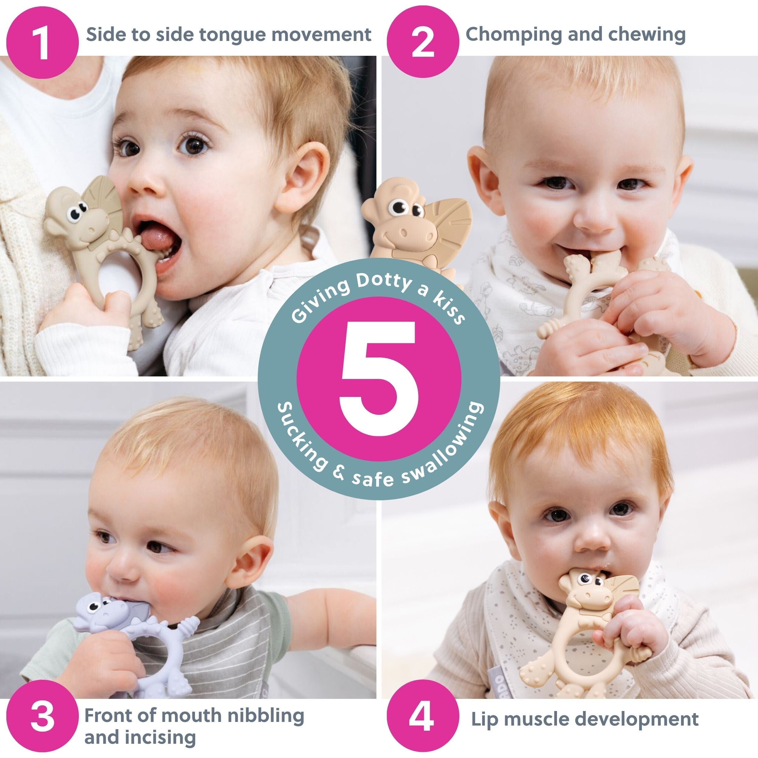 The teether encourages side-to-side tongue movement, mouth chewing, lip muscle development and safe swallowing. And promotes strong mouths, gums and jaws needed for speech