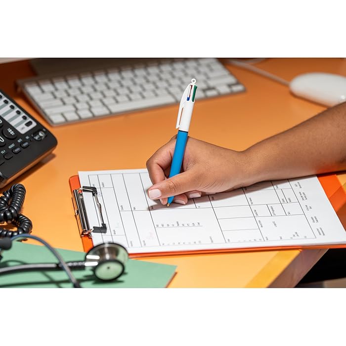 Change colours without changing pens. The BIC 4 Colours pen gives blue, red, green and black ballpoints all in one. Perfect for color coding your work and create your own bullet journal. Each of the 4 medium 1.0 mm ballpoints provides an average of 2 km of crisp precision writing. The classic design features a round barrel and a clip for attaching it to notebooks. BIC is simplicity itself.
