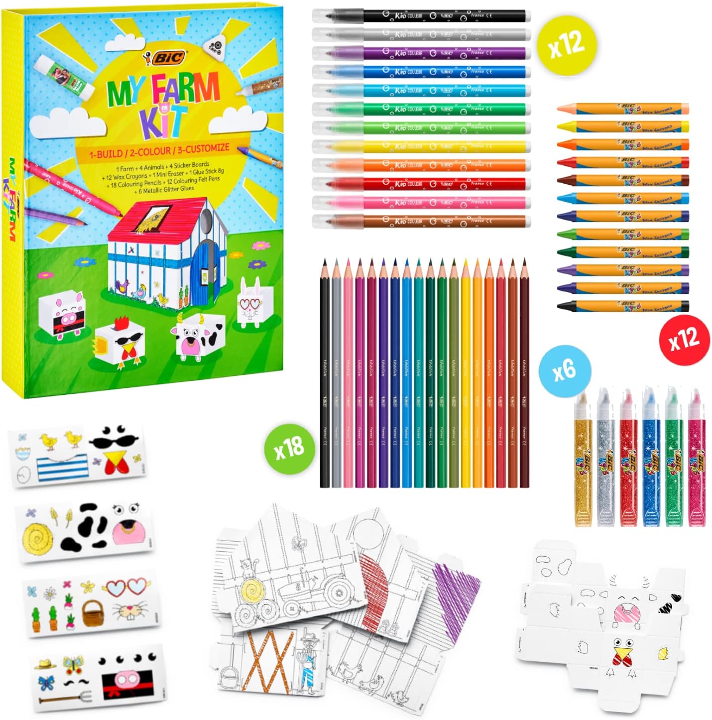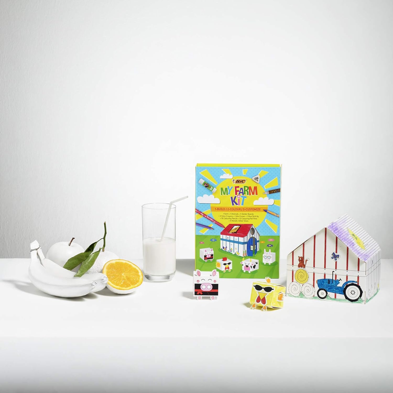 The BIC Kids My Farm Kit gives kids hours of fun colouring, decorating, and putting together their very own farm. It contains an amazing array of 50 colouring instruments plus stickers, paper animals and a barn.