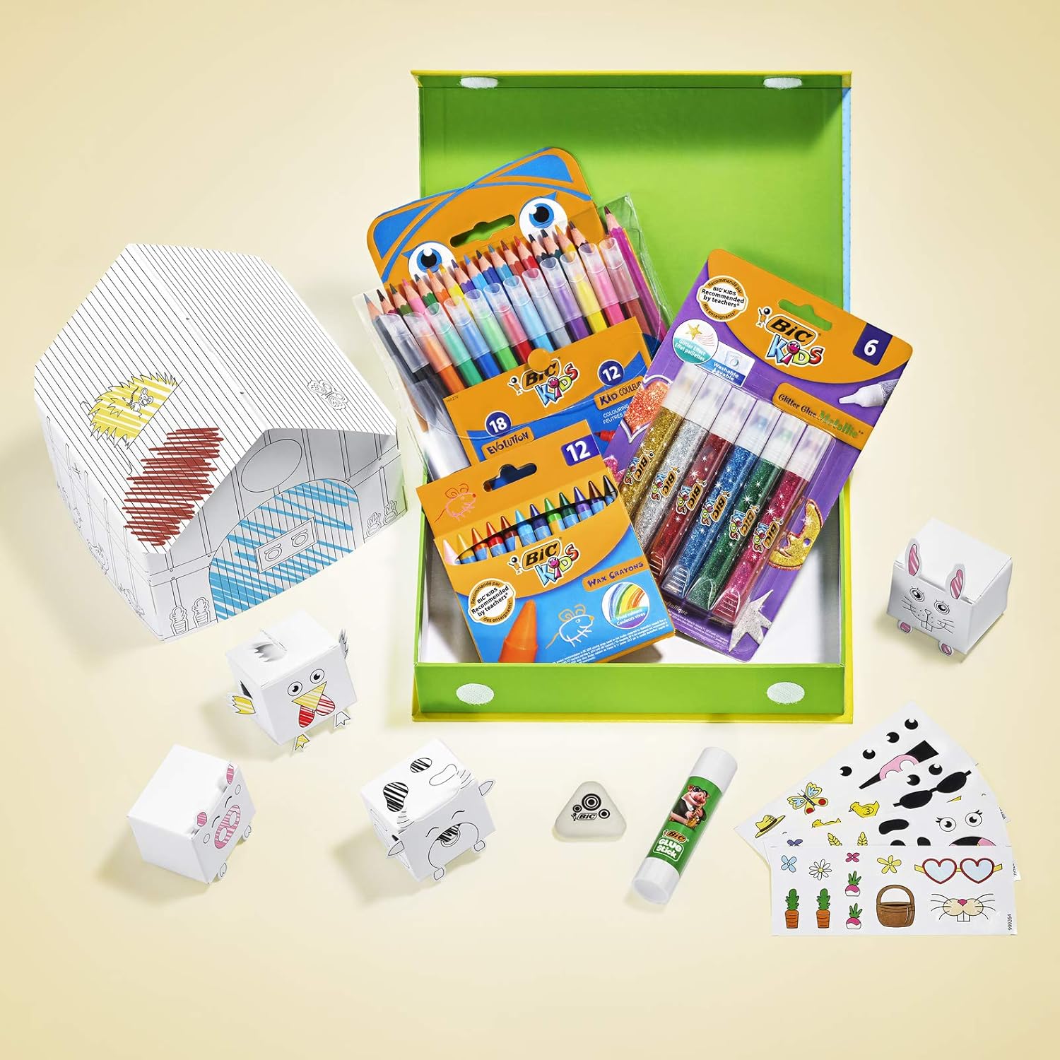In the box: 12 BIC Kids Wax Crayons in assorted colours with wide paper-covered barrels that keep hands clean; a rainbow of 12 BIC Kids Kid Couleur colouring felt pens with a fixed medium nib that doesn't get pushed in; 18 BIC Kids Evolution ECOlutions colouring pencils that are shock-resistant, chew-resistant, and never splinter if broken; a PVC-free BIC Mini Fun triangle eraser, 6 tubes in assorted colours of easy-clean BIC Kids Glitter Glue Metallic, and an 8 g BIC Evolution ECOlutions glue stick in an eco-friendly container. Kids decorate the paper barn and animals, and then assemble them to create a 3D farm. An exciting fun-filled gift on any special occasion. A great colouring kit for kids backed by decades of beloved BIC quality and expertise, plus a commitment to safety and fun. BIC does it again.