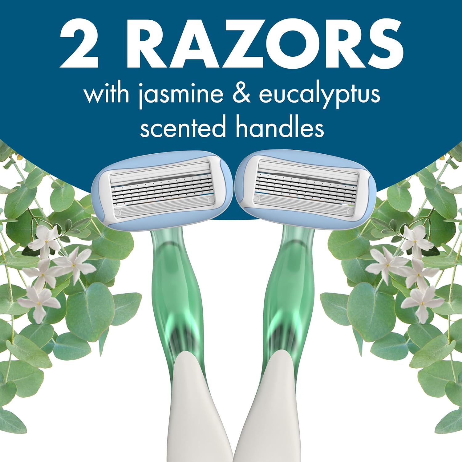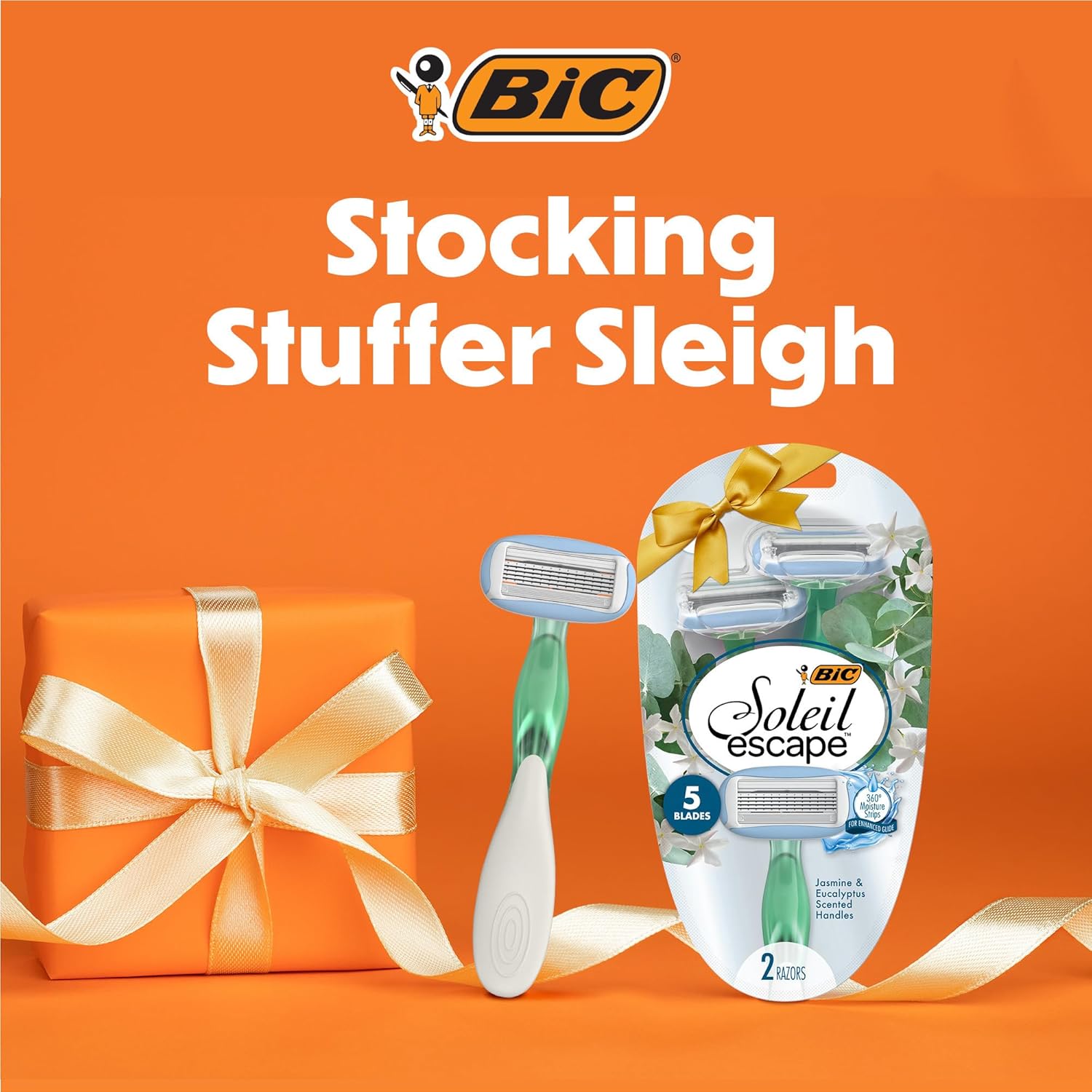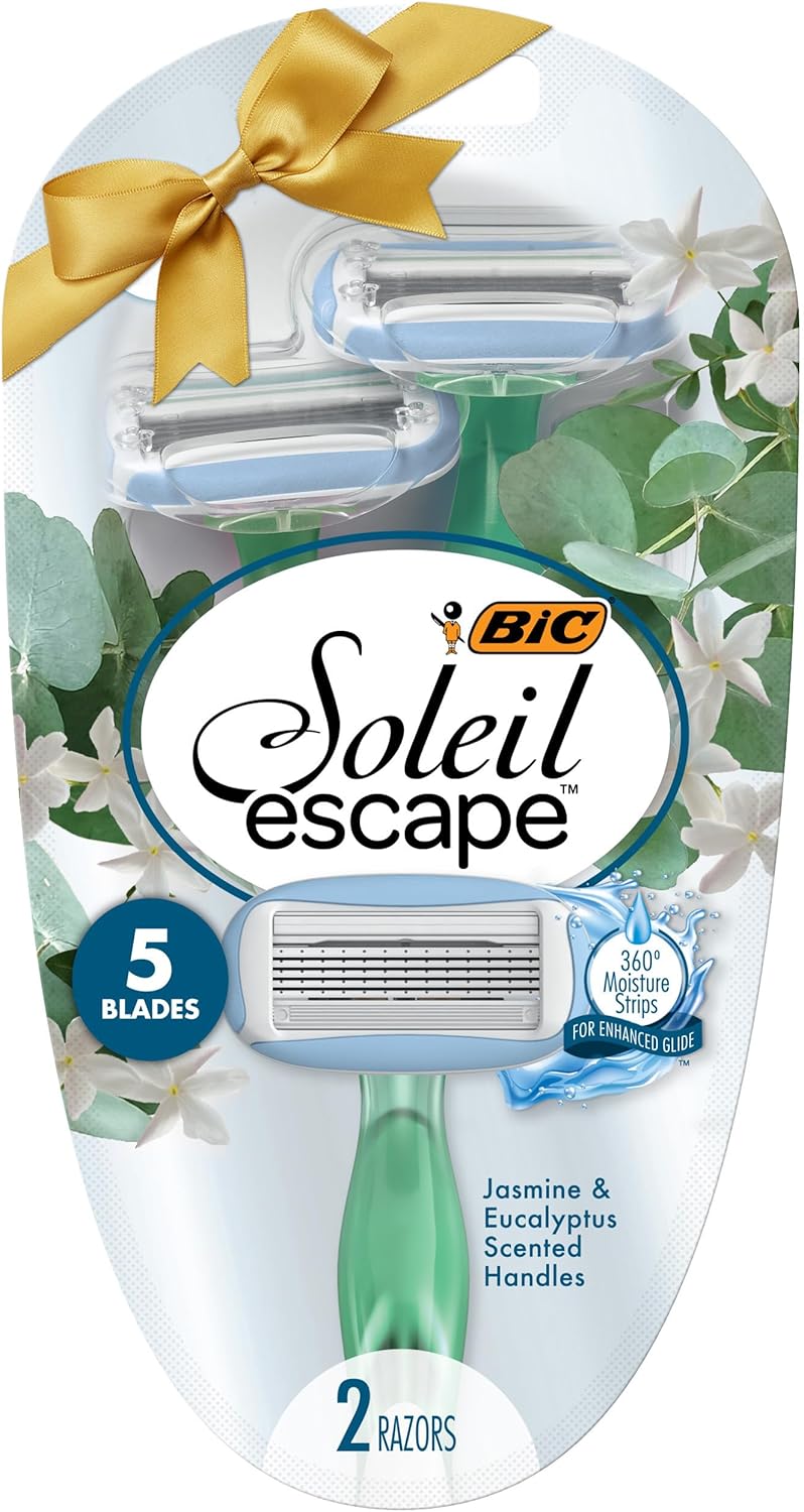 The BIC Soleil Escape 5-Blade Jasmine & Eucalyptus women's non-refillable razor delivers a close, comfortable shave with a scented handle. Featuring 5 long-lasting movable blades, it also has a rubber grip for added control and a pivoting head that hugs every curve. The 360° water-activated moisture strips enriched with Almond Oil provide enhanced glide for a smooth shave. The curved handle offers confident handling and is scented with soothing Jasmine & Eucalyptus. Make shaving a happy experience for body and mind.