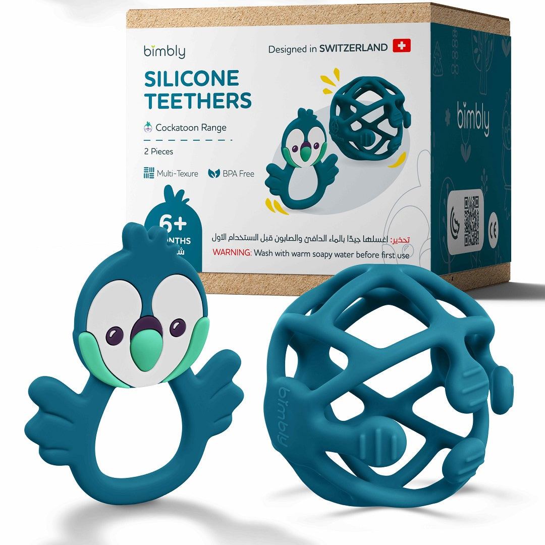 2-in-1 Silicone Purple Teethers from Bimbly. Ensure continuous comfort for your child with Bimbly's special teething toy set! Whether it's a teething toy in the shape of a cockatoo or a ball, you have everything you need for each stage of growth. Alleviate your child's pain and let them calm down and relax with the soft, gentle, and durable silicone teething toys.
