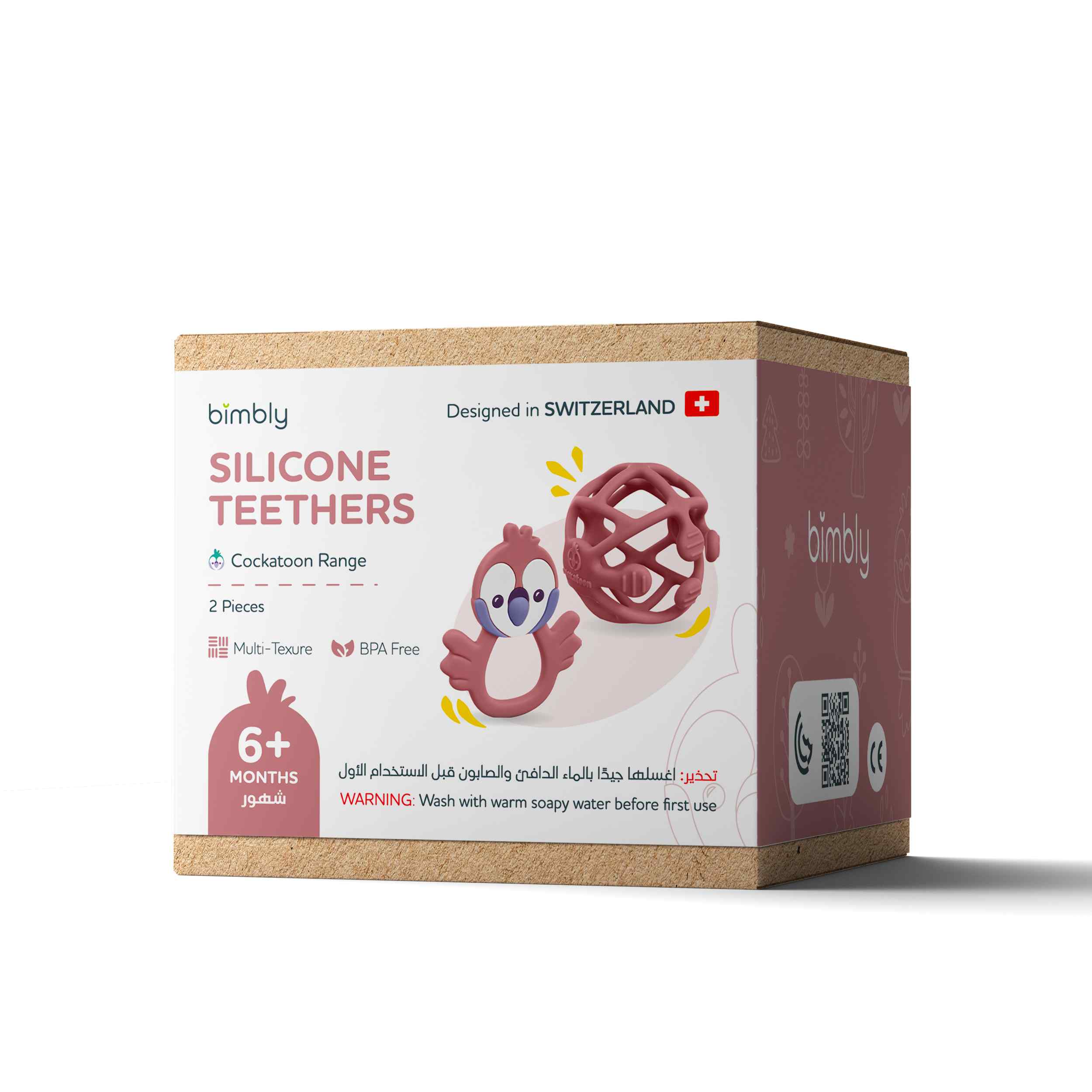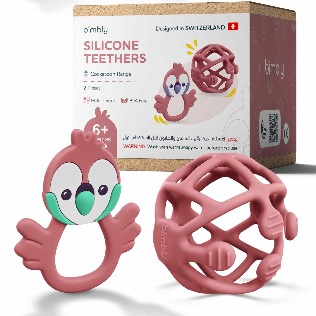 2-in-1 Silicone Purple Teethers from Bimbly. Ensure continuous comfort for your child with Bimbly's special teething toy set! Whether it's a teething toy in the shape of a cockatoo or a ball, you have everything you need for each stage of growth. Alleviate your child's pain and let them calm down and relax with the soft, gentle, and durable silicone teething toys.