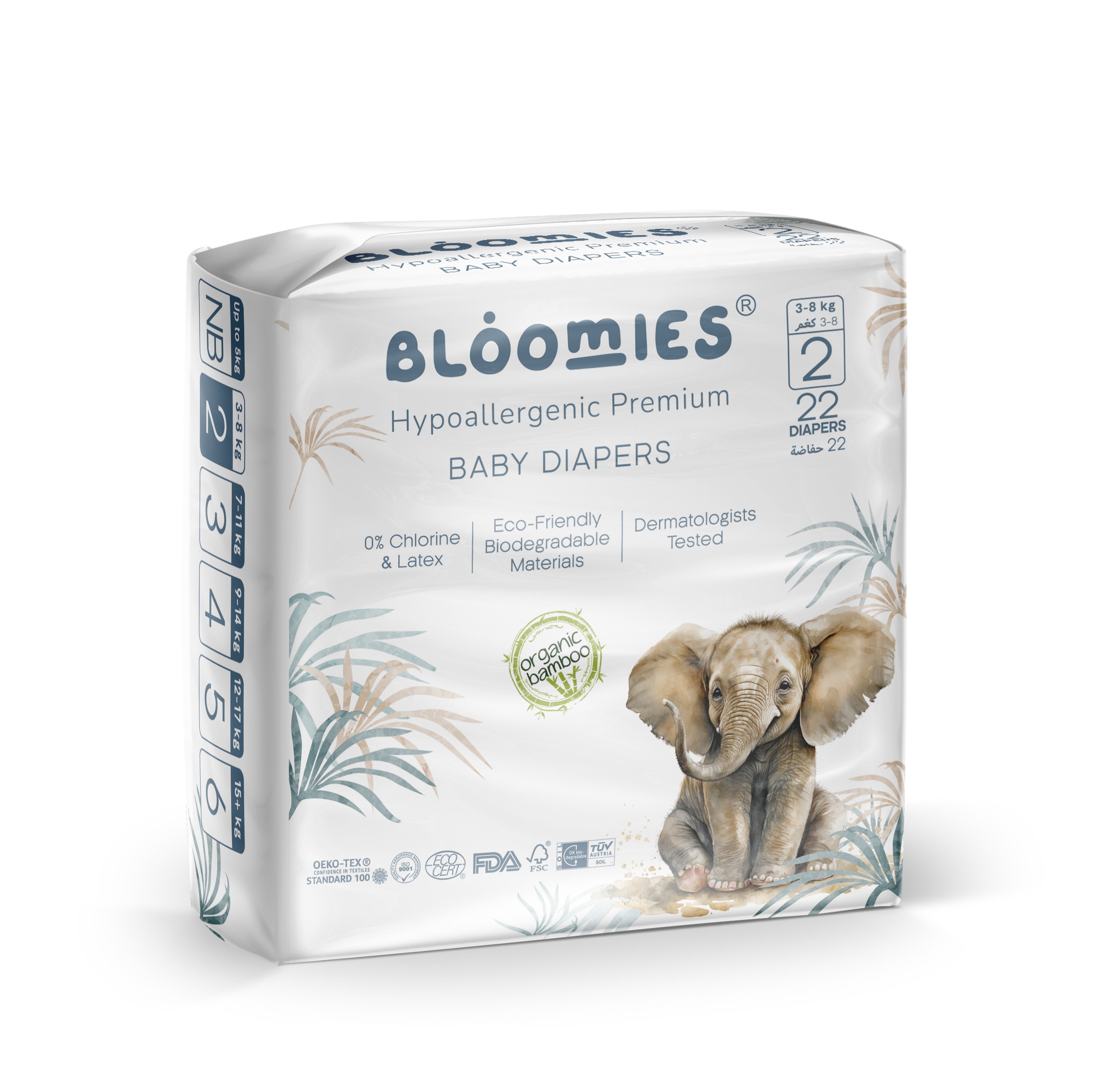Bloomies Premium Baby Diapers: Nurturing care for your newborn, made gentle and safe with hypoallergenic, Dermatologist tested materials. Crafted from 100% biodegradable bamboo, these disposable diapers are soft, breathable, Latex & Chlorine-free with a convenient wetness indicator. Nurture naturally with Bloomies, where babies bloom.