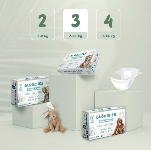 Bloomies Premium Baby Diapers: Nurturing care for your newborn, made gentle and safe with hypoallergenic, Dermatologist tested materials. Crafted from 100% biodegradable bamboo, these disposable diapers are soft, breathable, Latex & Chlorine-free with a convenient wetness indicator. Nurture naturally with Bloomies, where babies bloom.