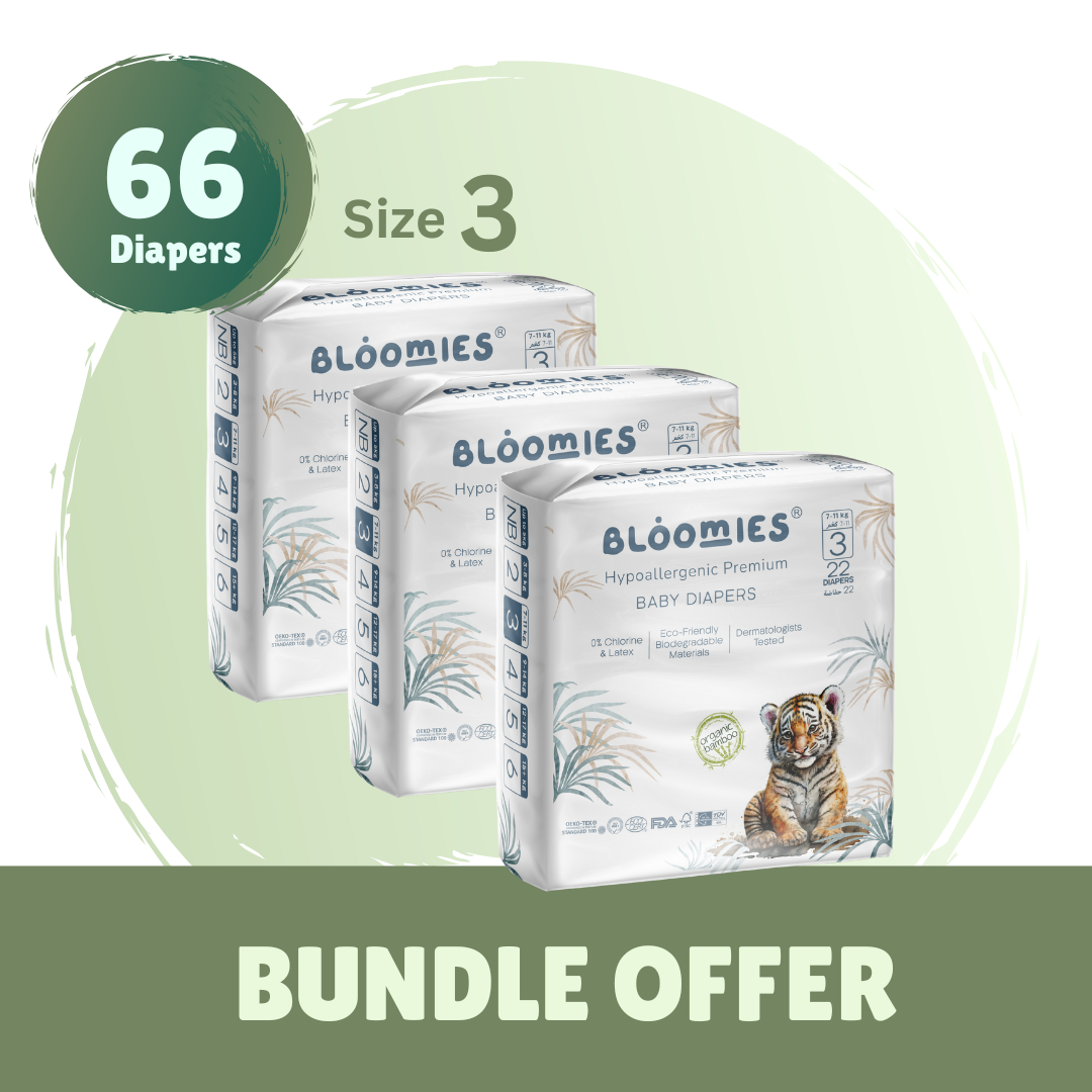 Bloomies Premium Baby Diapers: Nurturing care for your newborn, made gentle and safe with hypoallergenic, Dermatologist tested materials. Crafted from 100% biodegradable bamboo, these disposable diapers are soft, breathable, Latex & Chlorine-free with a convenient wetness indicator. Nurture naturally with Bloomies, where babies bloom.