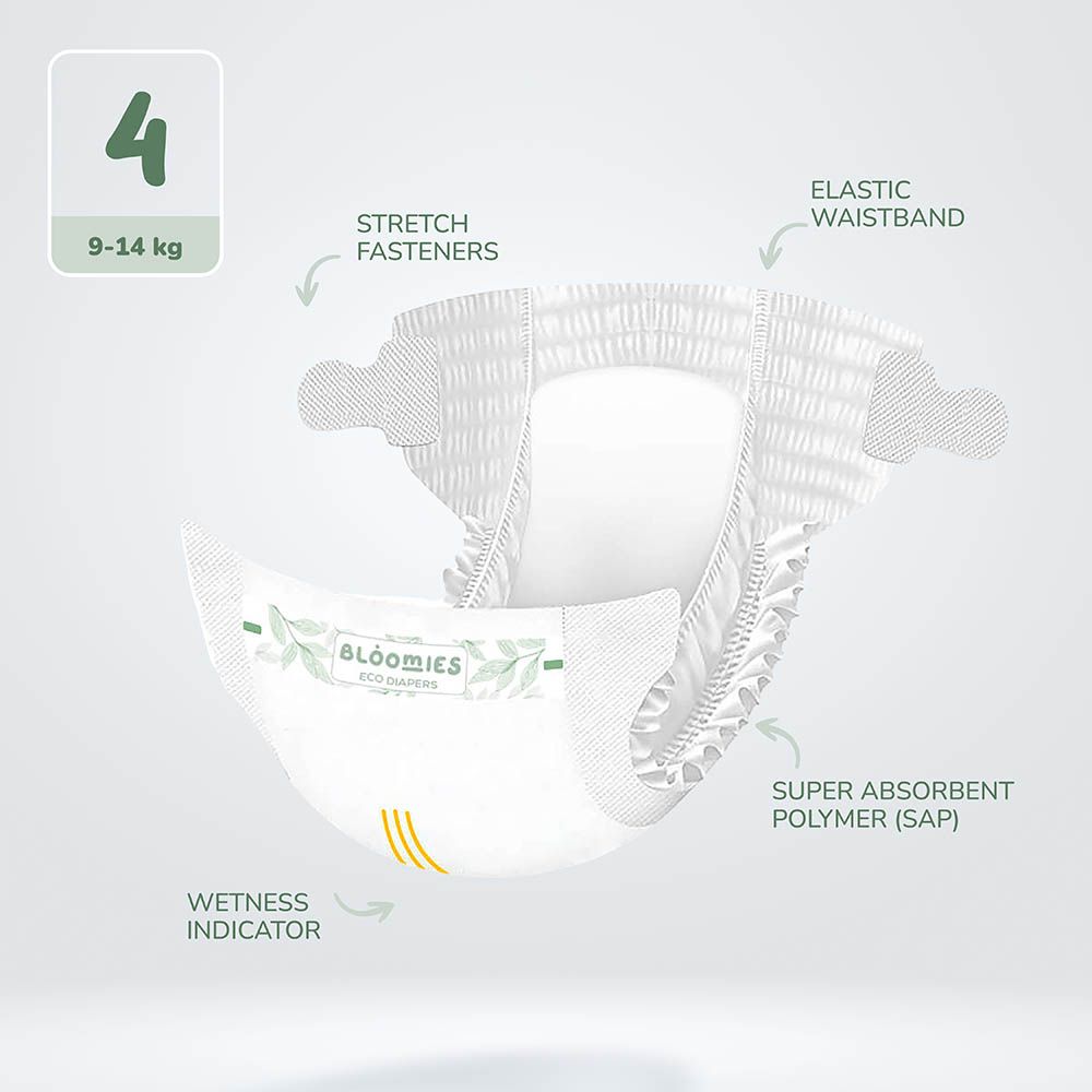 - Premium Features - Bloomies premium diapers include stretch fasteners, Super Absorbent Polymer (SAP), an elastic waistband, and a wetness indicator