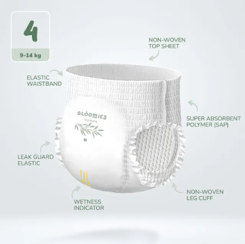 - Premium Features: Bloomies premium diapers include stretch fasteners, Super Absorbent Polymer (SAP), an elastic waistband, and a wetness indicator