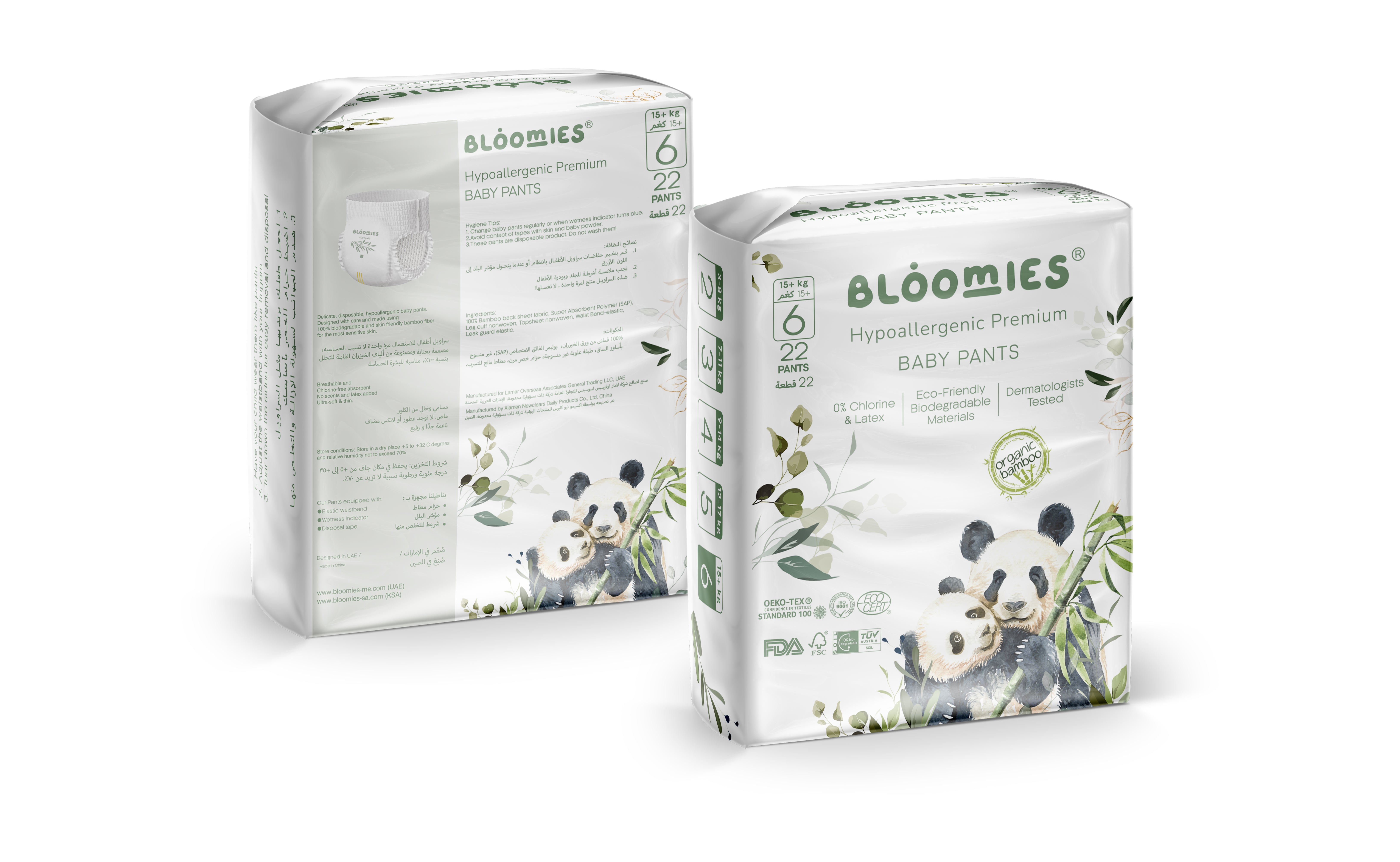 Bloomies Premium Baby Pants: Comfort that grows with your baby, designed with eco-consciousness and baby's delicate skin in mind. These disposable baby pants are flexible, gentle, provide 360° leak protection and are crafted with breathable, 100% biodegradable bamboo. Dermatologist tested, Latex & Chlorine-free for sensitive skin. Nurture naturally with Bloomies, where babies bloom.