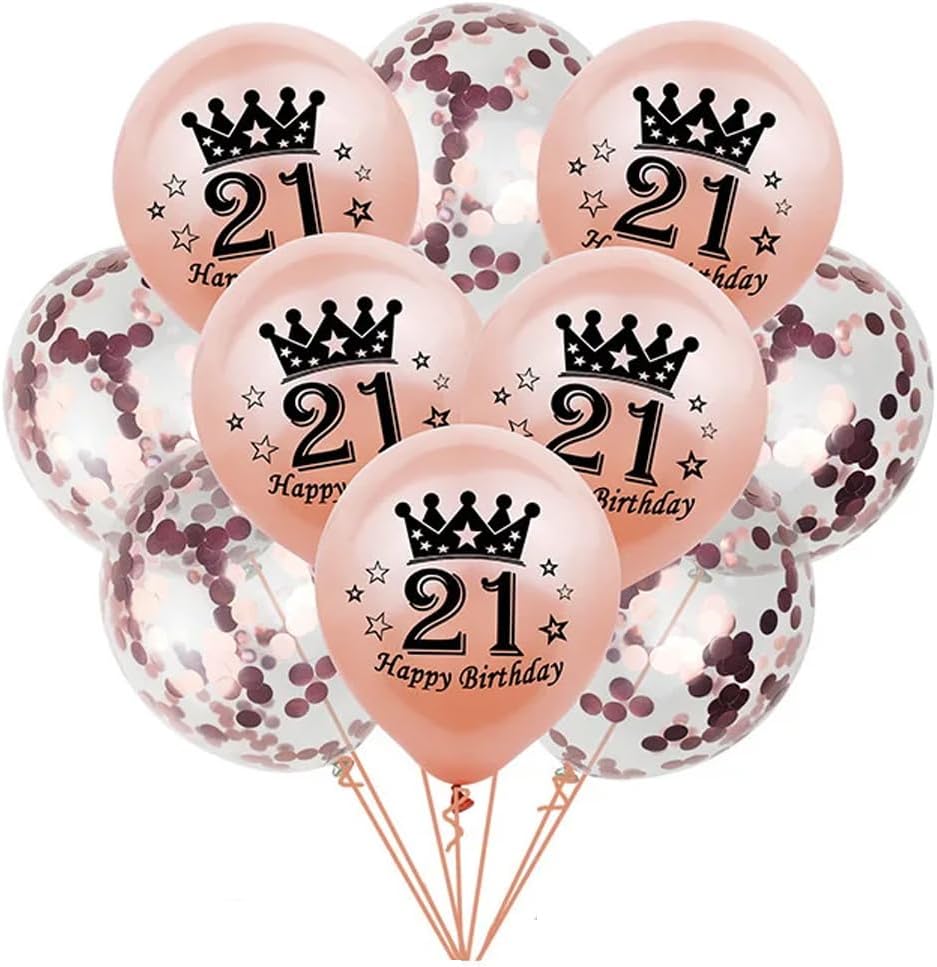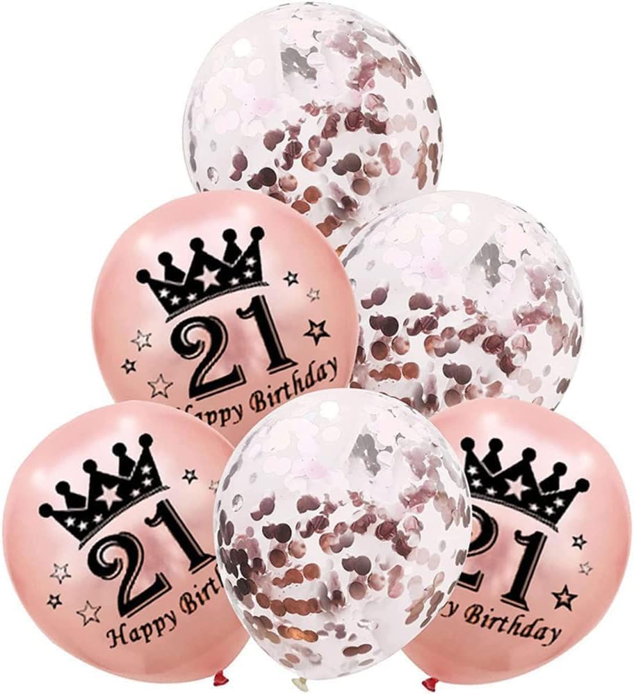 - 21st BIRTHDAY BALLOONS SET: Includes 10 latex balloons – 5 rose gold "21 Happy Birthday" print and 5 clear confetti balloons with rose gold confetti.